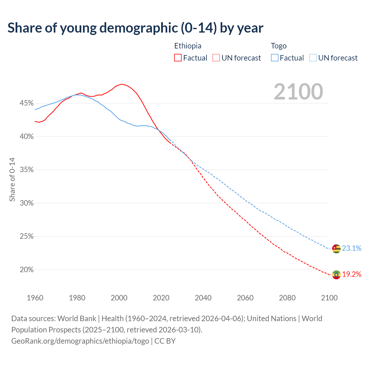 - The share of young demographic (0-15 years old) in Ethiopia is 39.1% vs 39.5% in Togo.