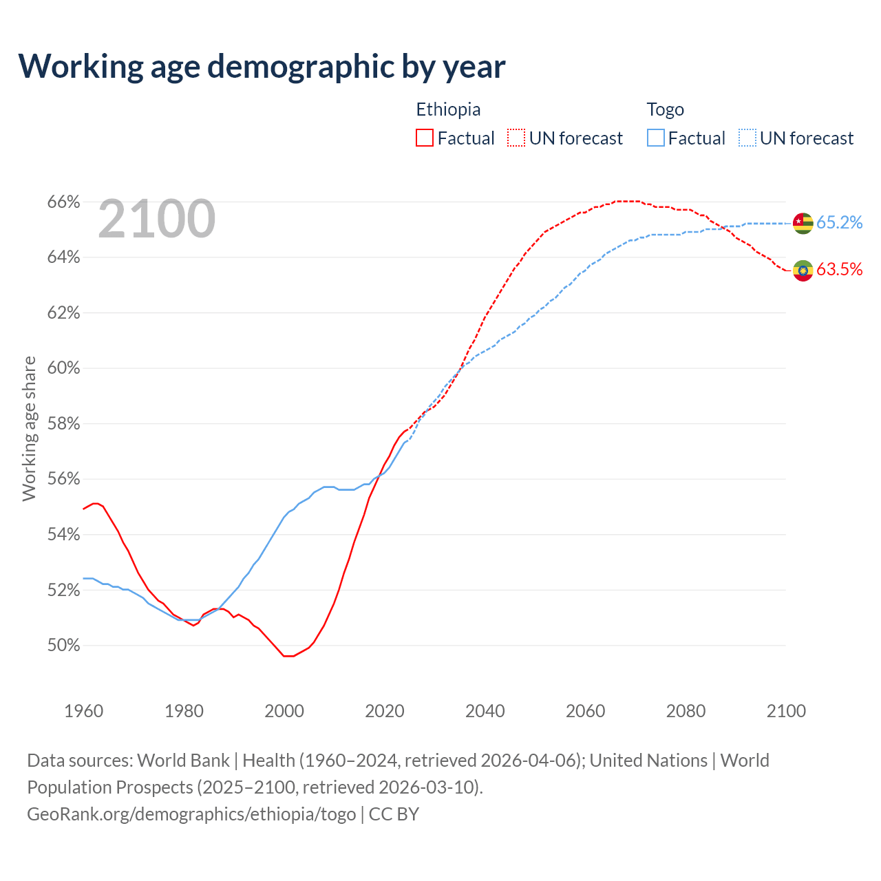 - Ethiopia has 80.7M working age adults (aged 15-64) vs 5.72M in Togo.