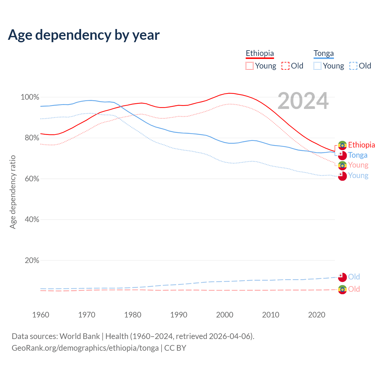 - The share of old-age demographic (65+) in Ethiopia is 3.23% vs 6.72% in Tonga.