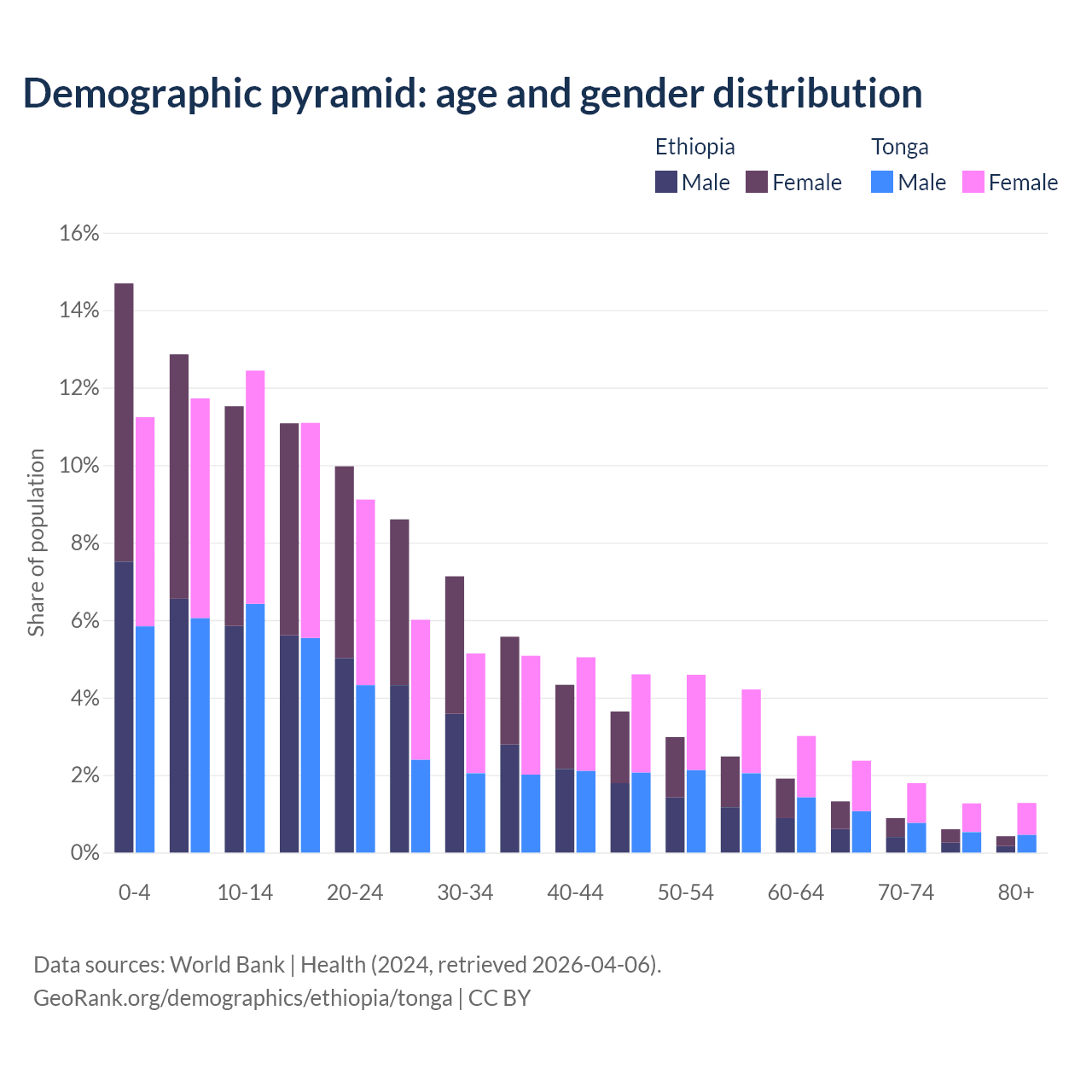 - Ethiopia is ranked 167/196 by median age (oldest to youngest) vs 149/196 for Tonga.