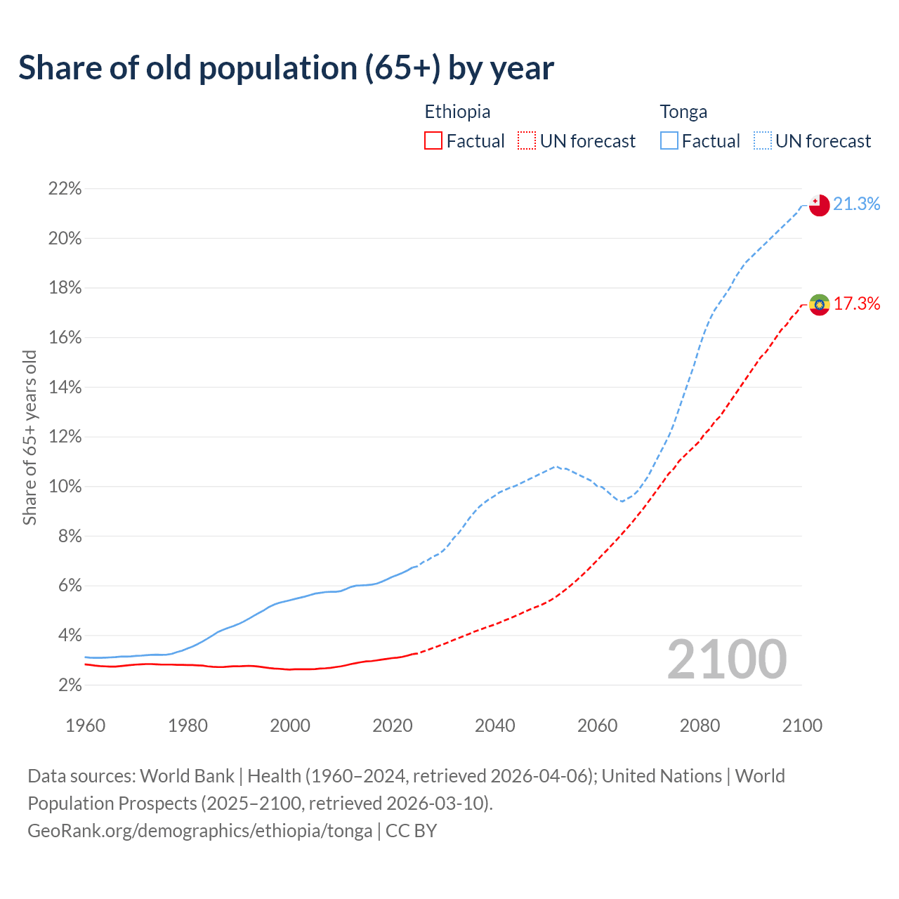 The share of older people aged 65 and over is 3.23% in Ethiopia and 6.72% in Tonga. Life expectancy in Ethiopia compared to Tonga .