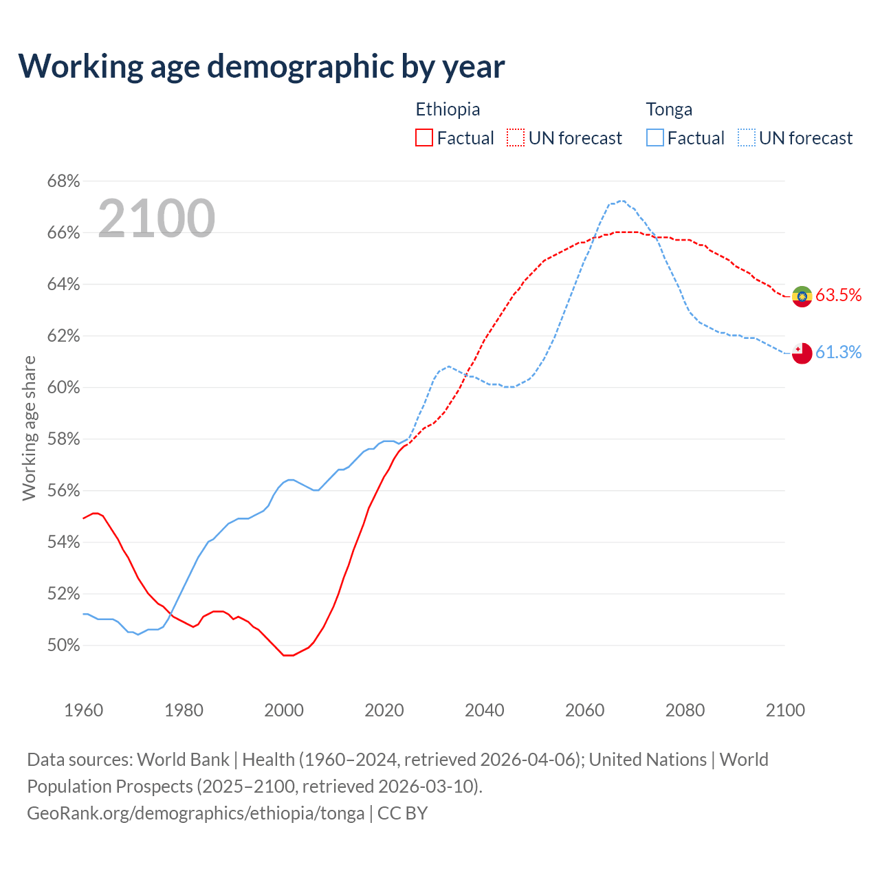 - Ethiopia has 80.7M working age adults (aged 15-64) vs 59.8K in Tonga.