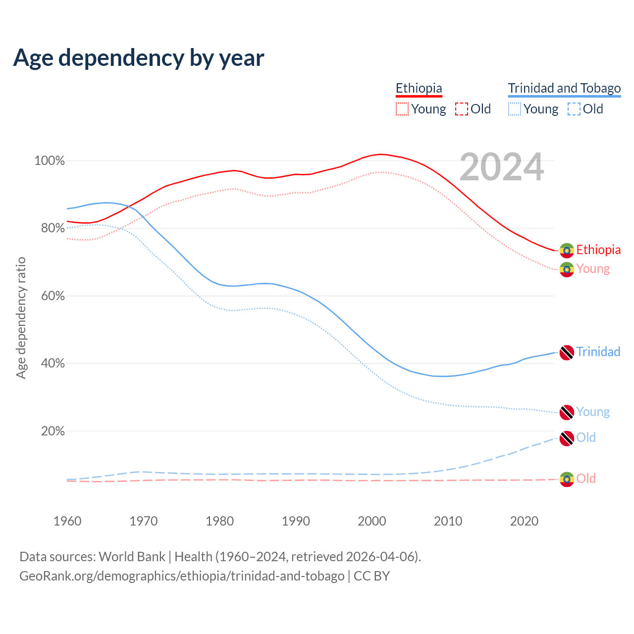 - The share of old-age demographic (65+) in Ethiopia is 3.23% vs 12.4% in Trinidad and Tobago.