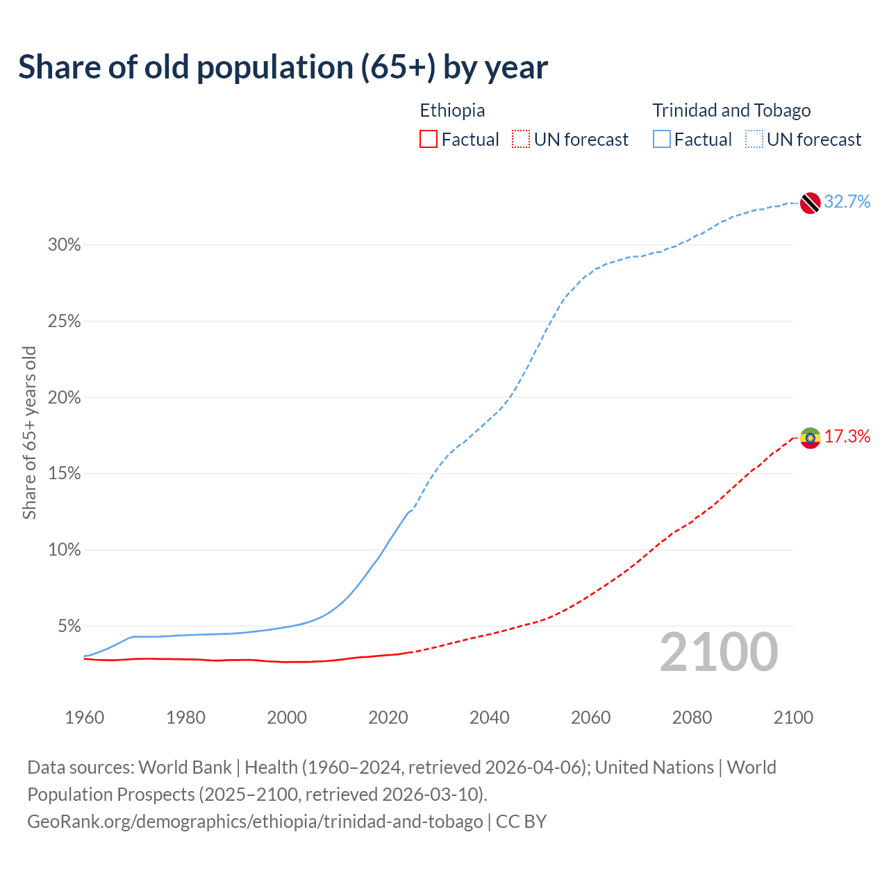 The share of older people aged 65 and over is 3.23% in Ethiopia and 12.4% in Trinidad and Tobago. Life expectancy in Ethiopia compared to Trinidad and Tobago .