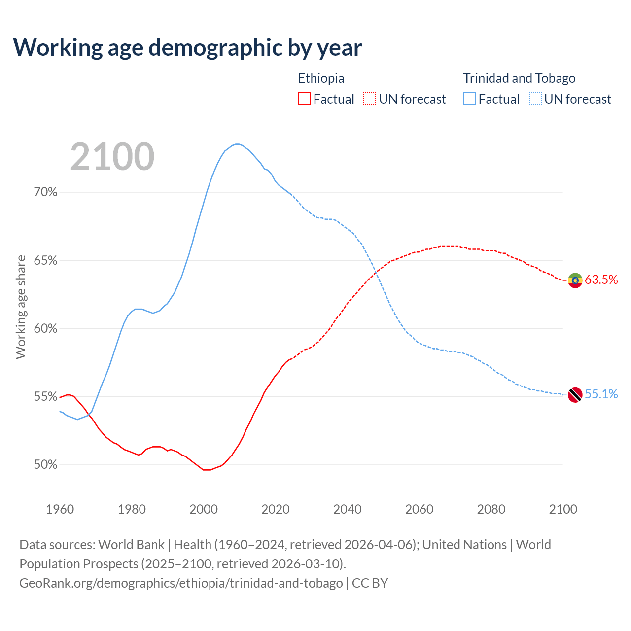 - Ethiopia has 80.7M working age adults (aged 15-64) vs 960K in Trinidad and Tobago.