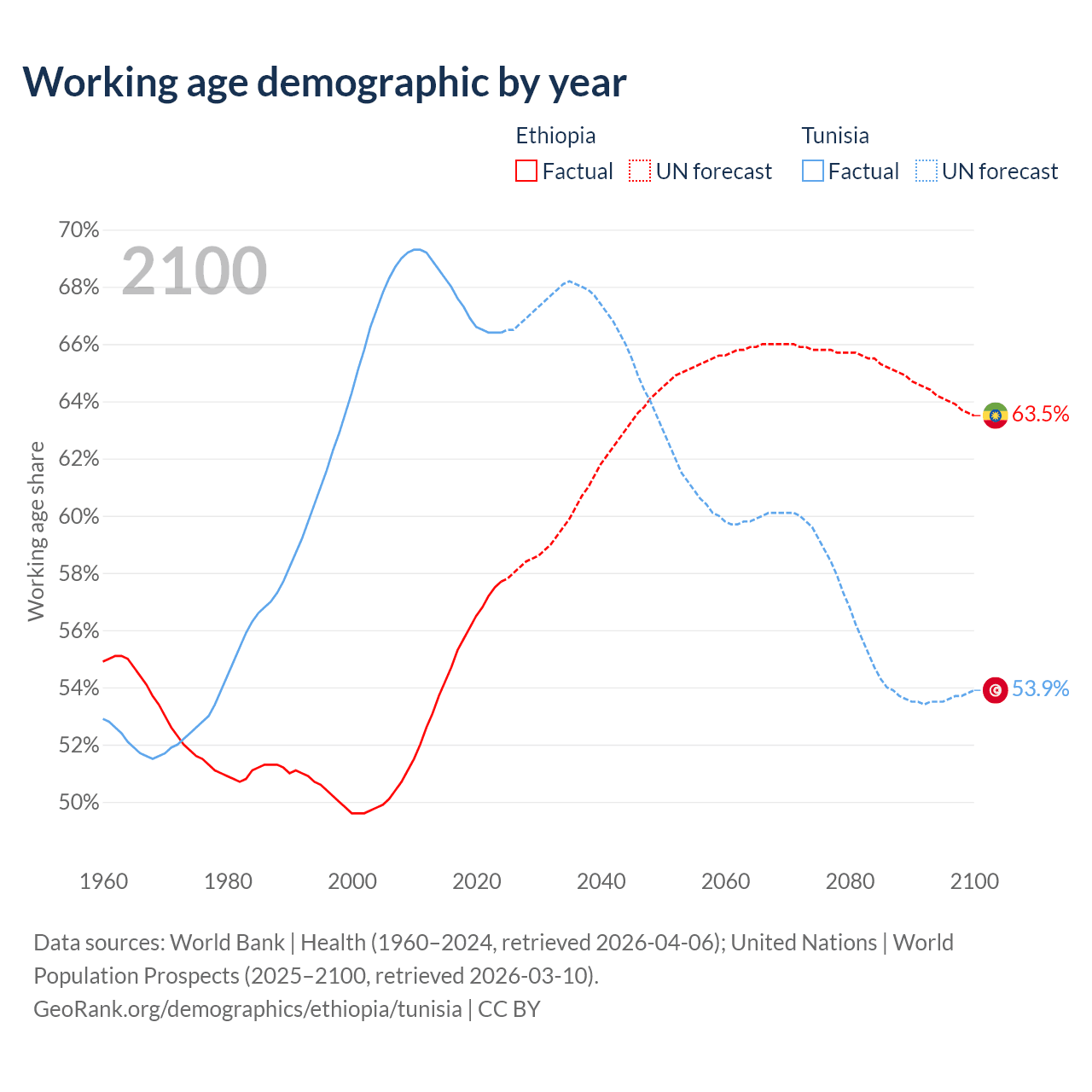 - Ethiopia has 80.7M working age adults (aged 15-64) vs 8.26M in Tunisia.