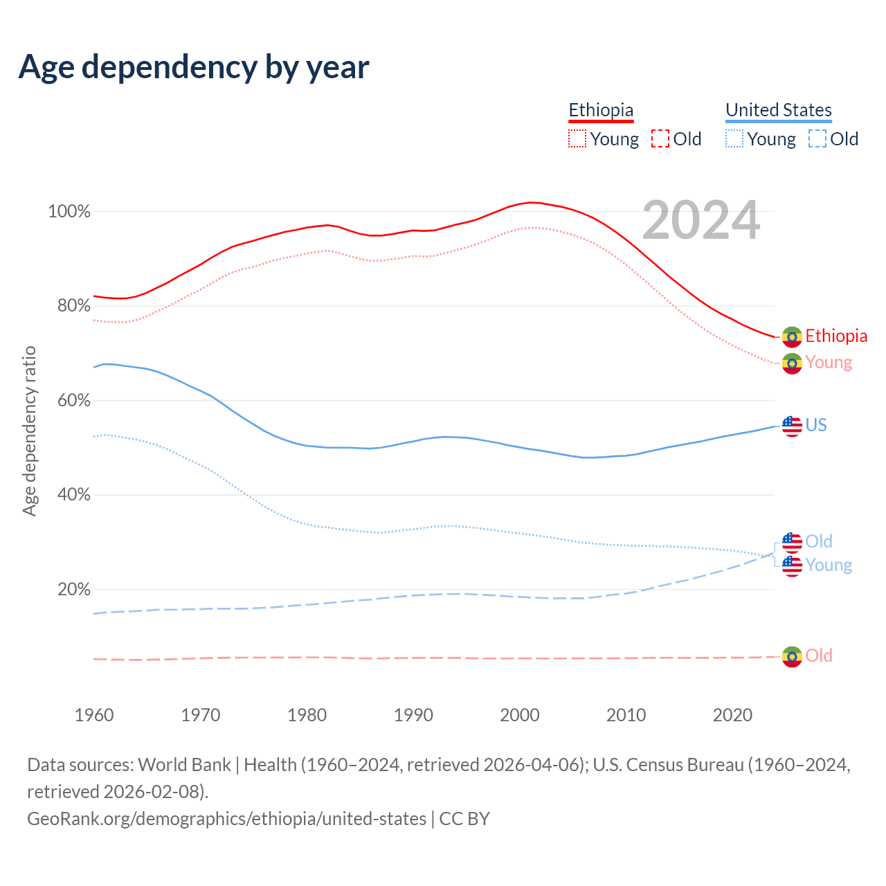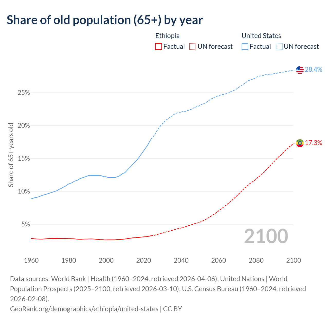 - The share of old-age demographic (65+) in Ethiopia is 3.23% vs 17.9% in the United States.