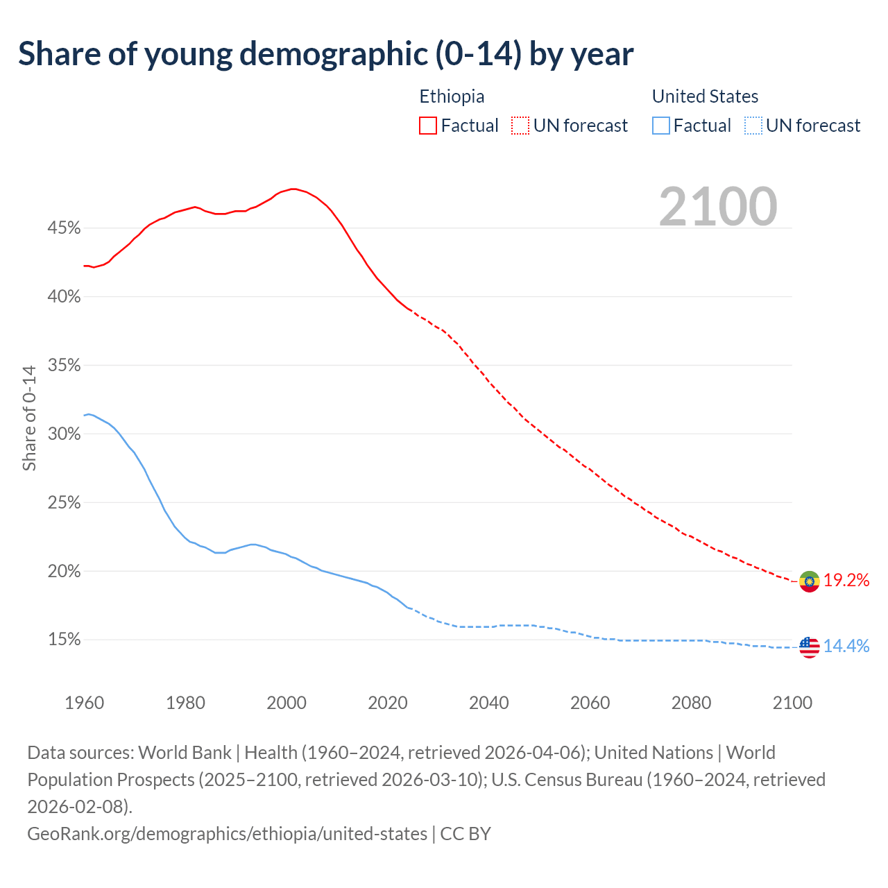 - The share of young demographic (0-15 years old) in Ethiopia is 39.1% vs 17.3% in the United States.