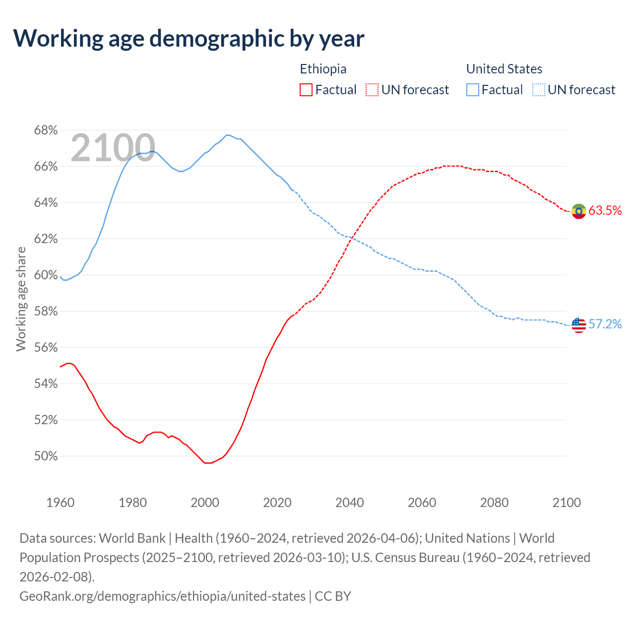 - Ethiopia has 80.7M working age adults (aged 15-64) vs 223M in the United States.