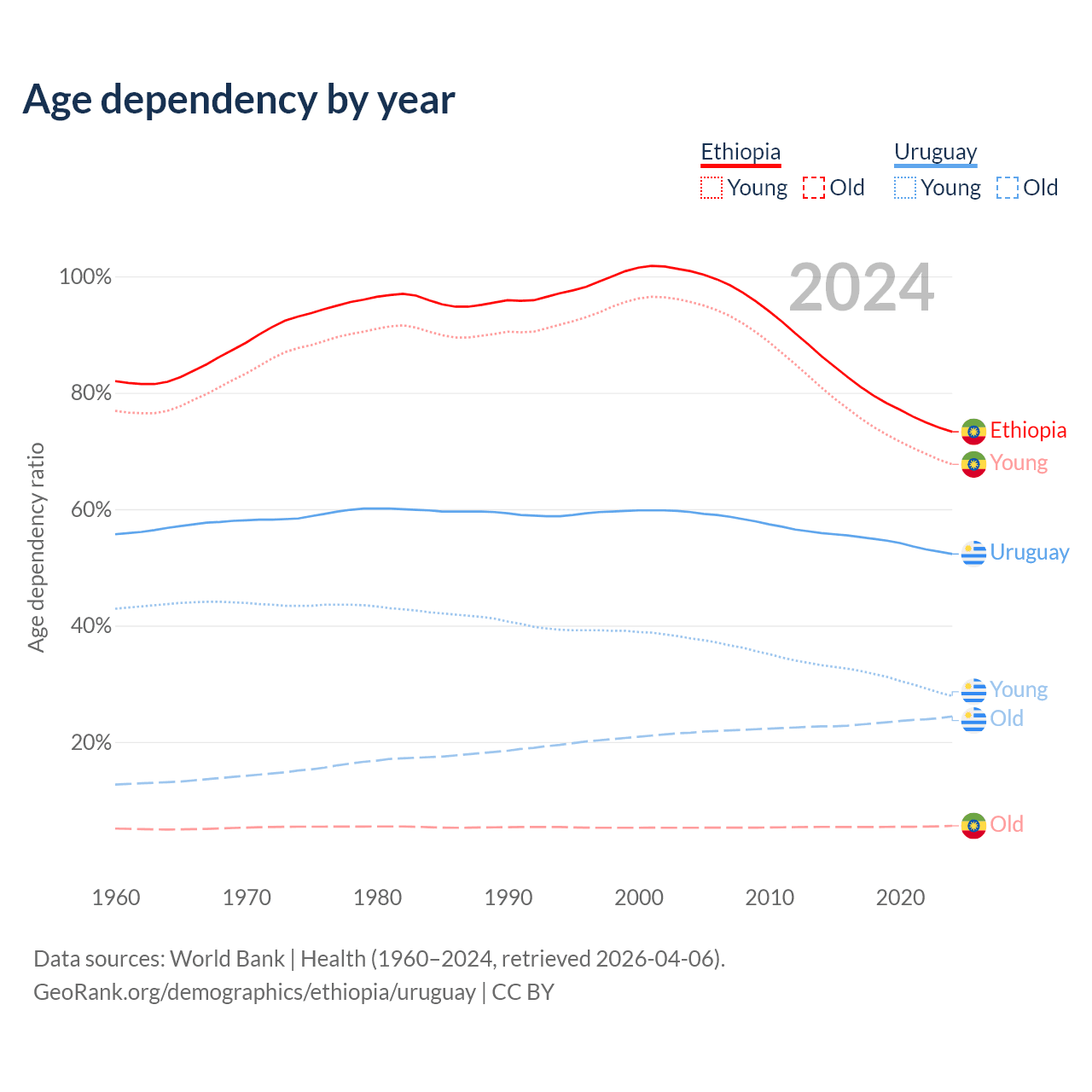 The share of older people aged 65 and over is 3.23% in Ethiopia and 16% in Uruguay. Life expectancy in Ethiopia compared to Uruguay .