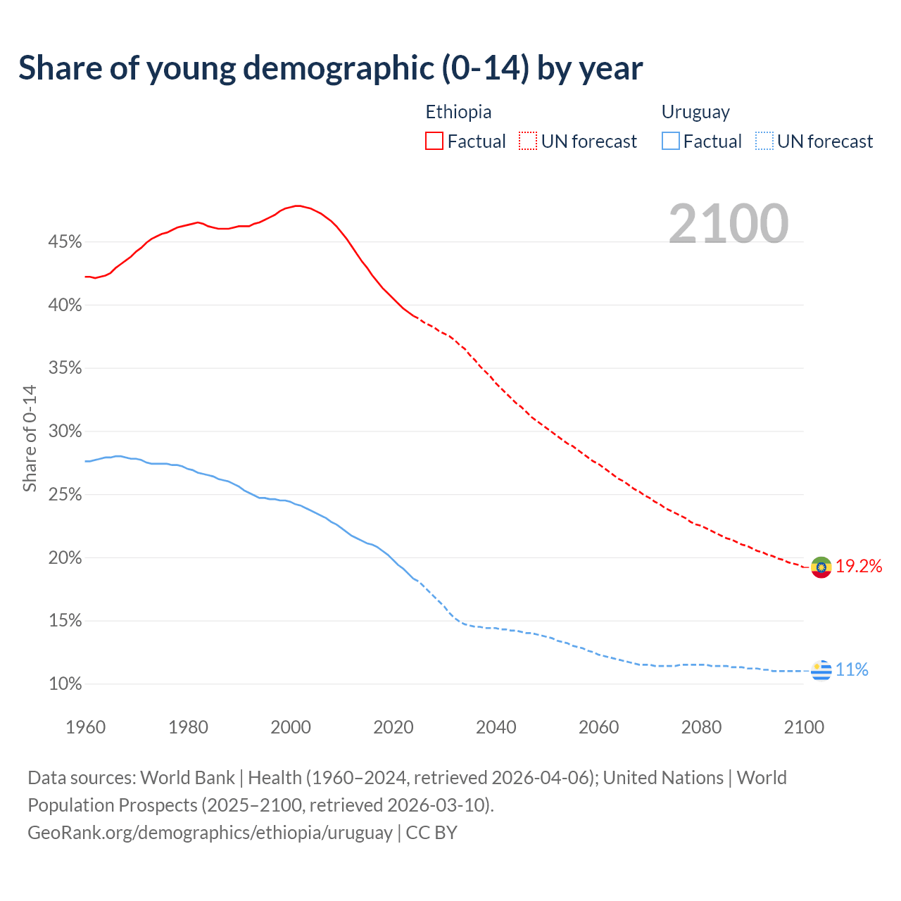 - The share of young demographic (0-15 years old) in Ethiopia is 39.1% vs 18.3% in Uruguay.
