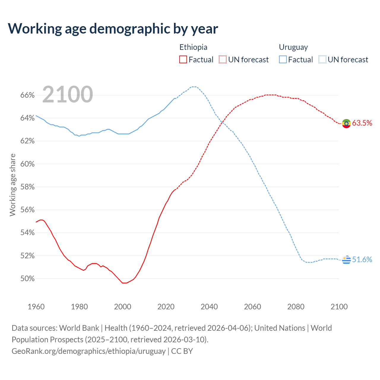 - Ethiopia has 80.7M working age adults (aged 15-64) vs 2.22M in Uruguay.