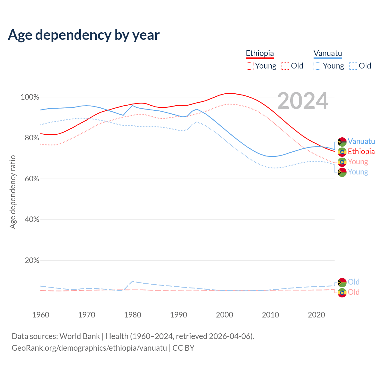 - The share of old-age demographic (65+) in Ethiopia is 3.23% vs 4.3% in Vanuatu.