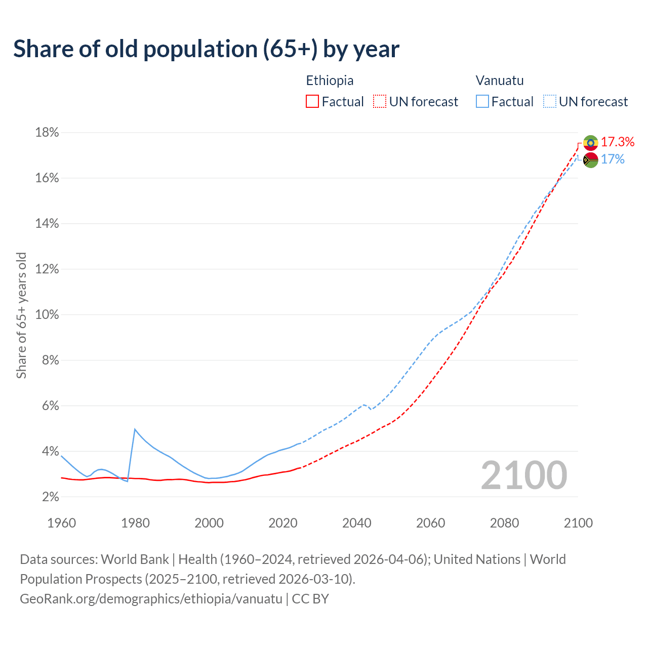 The share of older people aged 65 and over is 3.23% in Ethiopia and 4.3% in Vanuatu. Life expectancy in Ethiopia compared to Vanuatu .