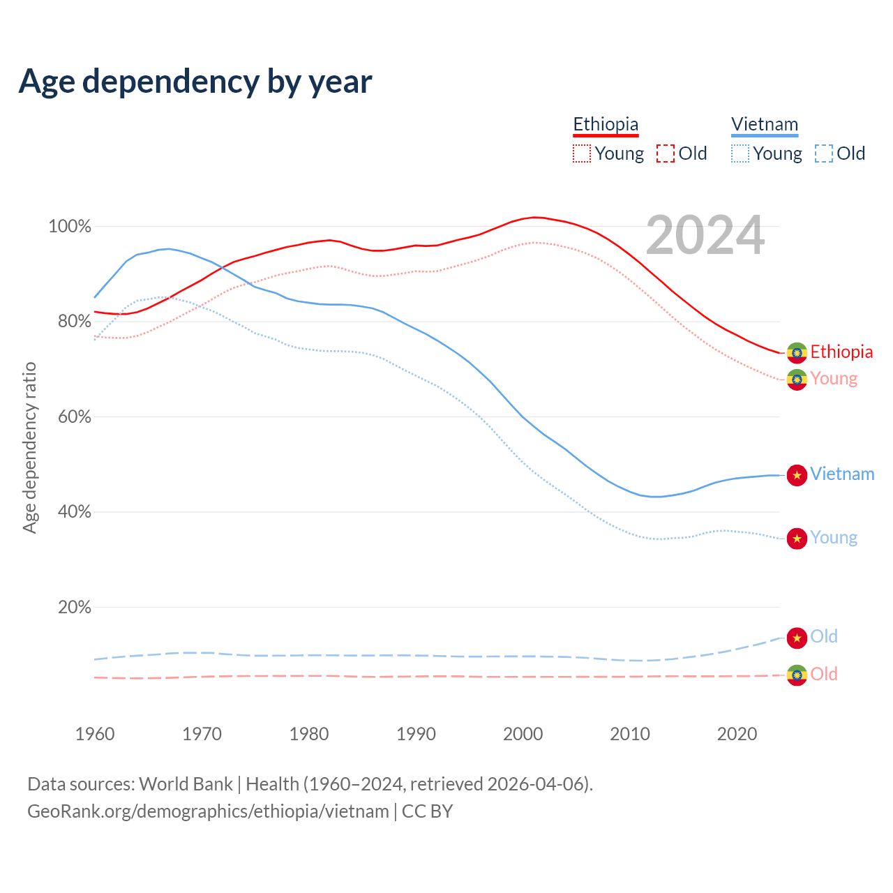Data sources: World Bank | Health (1960–2024, retrieved 2026-04-06); U.S. Census Bureau (1960–2024, retrieved 2026-02-08).
