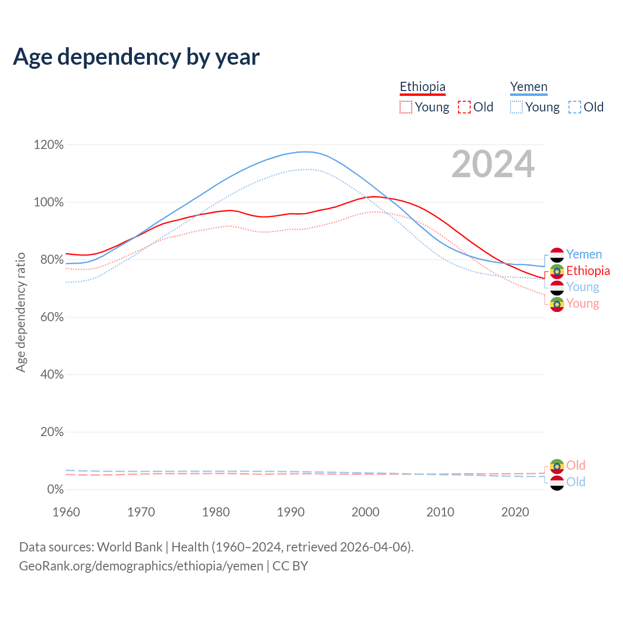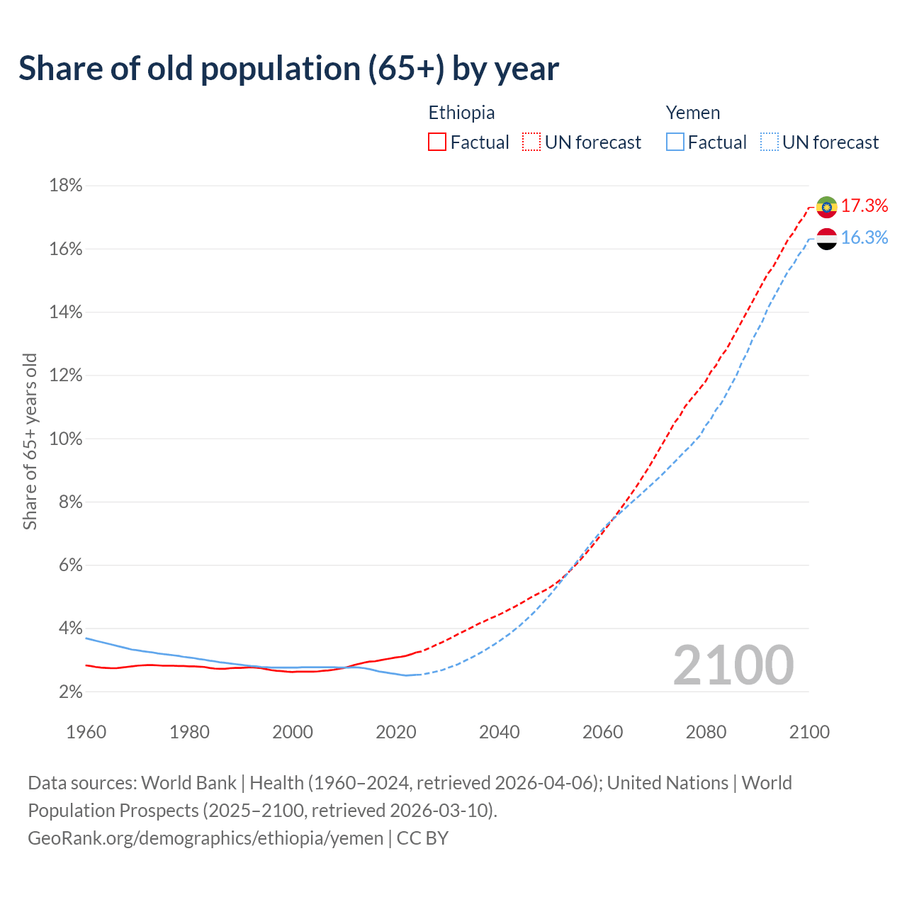 - The share of old-age demographic (65+) in Ethiopia is 3.23% vs 2.52% in Yemen.