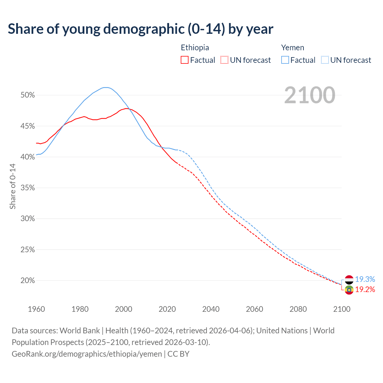 - The share of young demographic (0-15 years old) in Ethiopia is 39.1% vs 41.1% in Yemen.