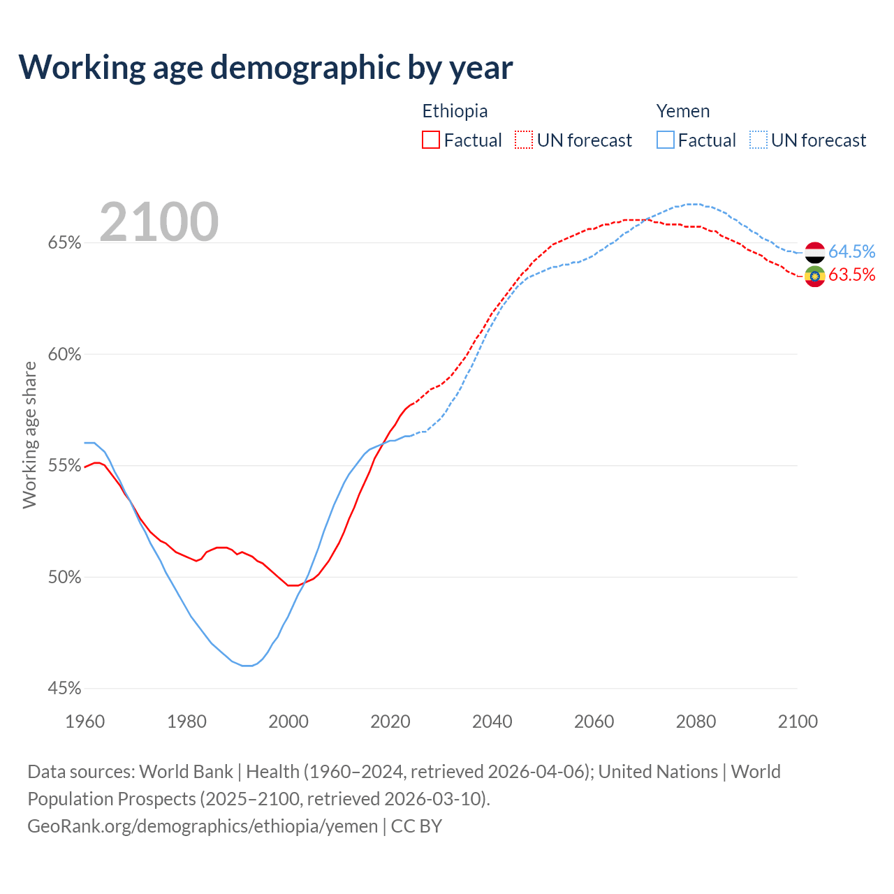 - Ethiopia has 80.7M working age adults (aged 15-64) vs 24.4M in Yemen.