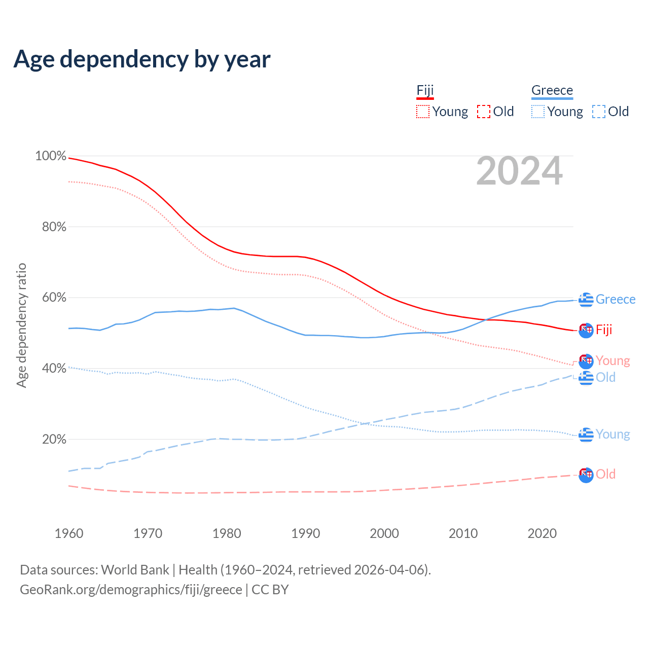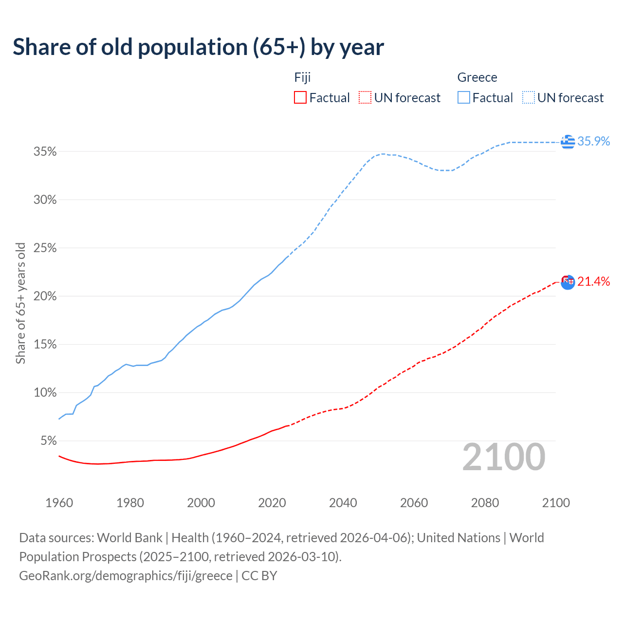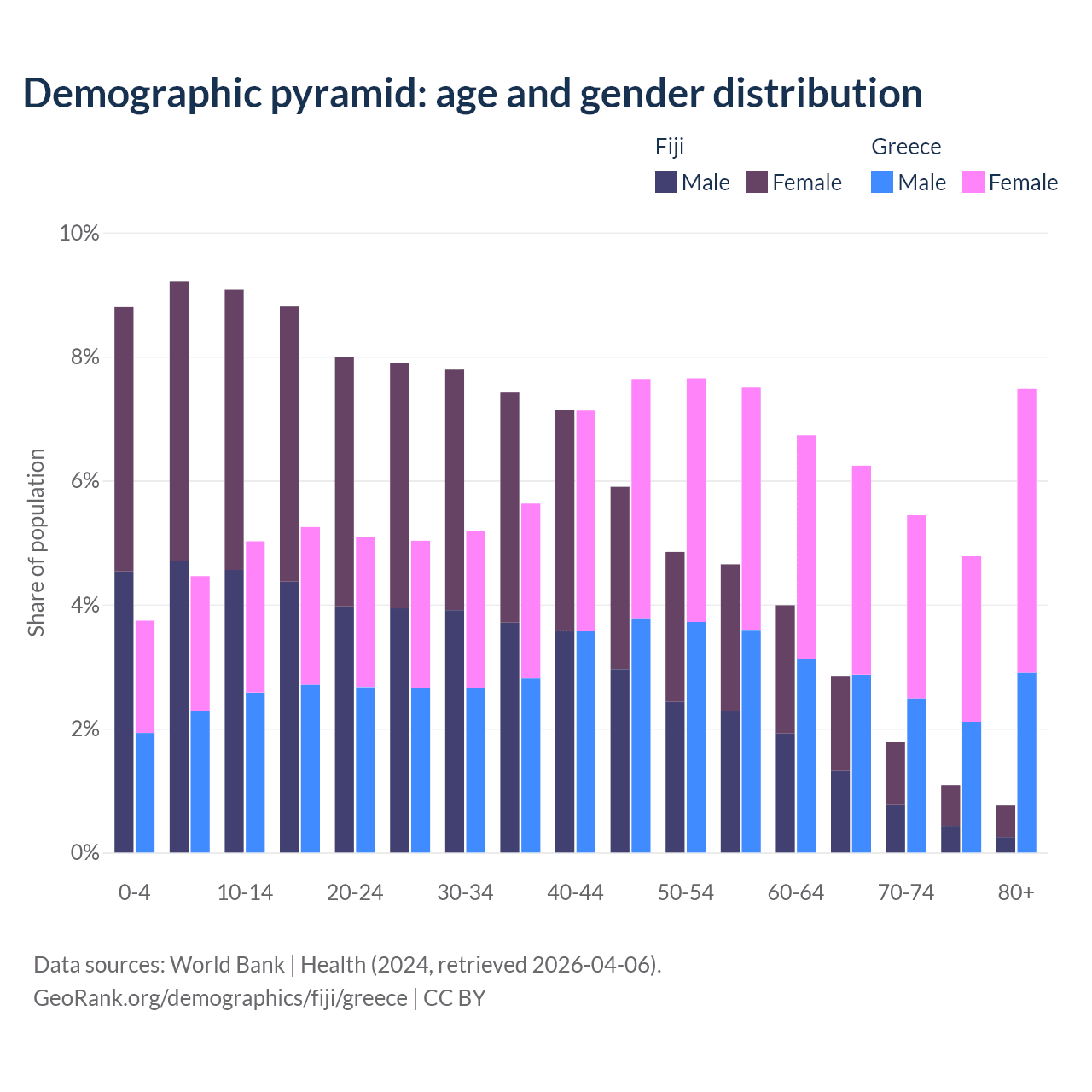 - The share of old-age demographic (65+) in Fiji is 6.49% vs 23.9% in Greece.