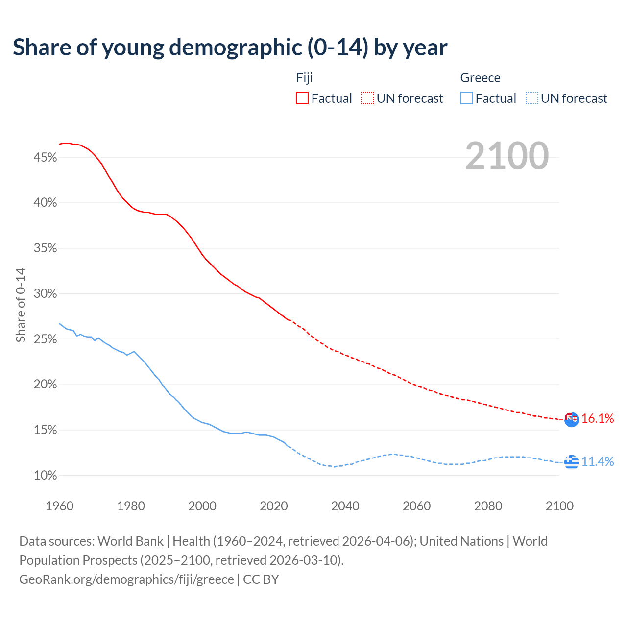 - The share of young demographic (0-15 years old) in Fiji is 27.1% vs 13.2% in Greece.