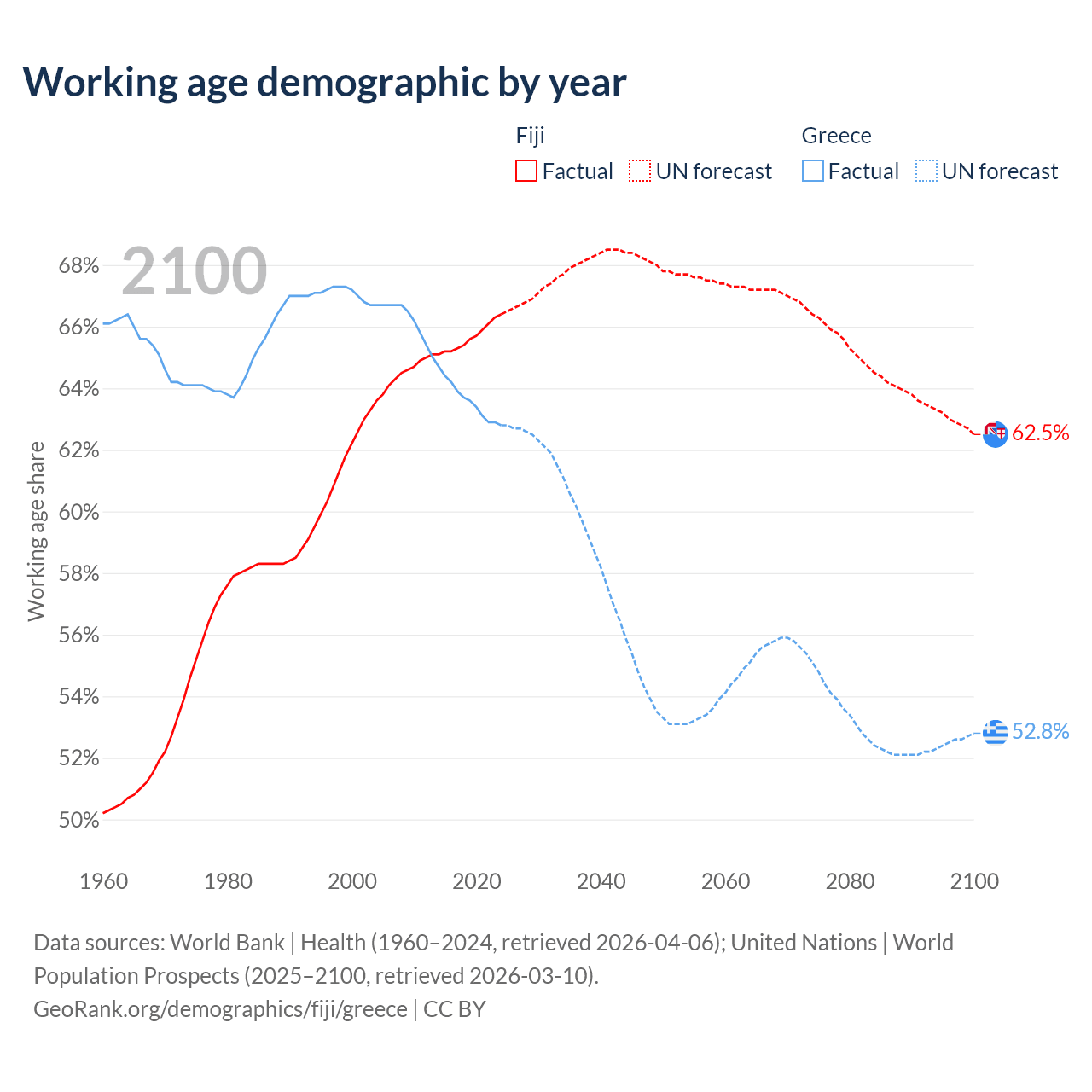 Median age Fiji vs Greece, 1960-2100
