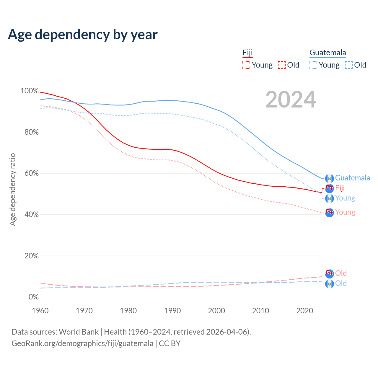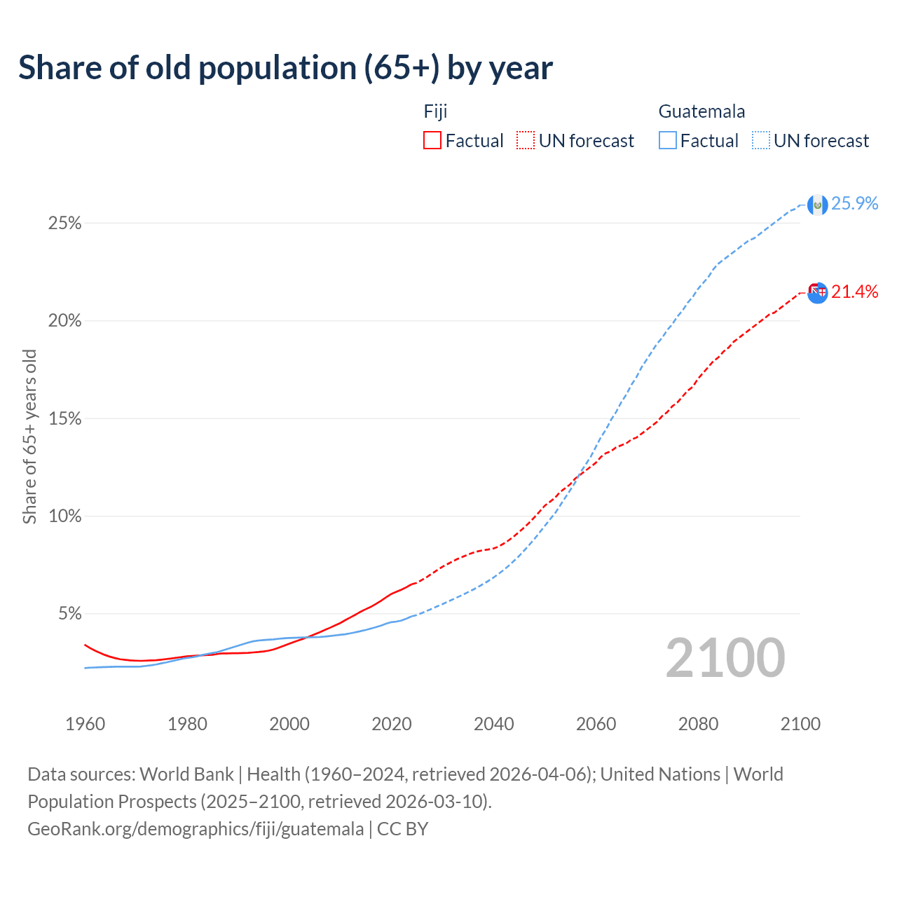 - The share of old-age demographic (65+) in Fiji is 6.49% vs 4.85% in Guatemala.