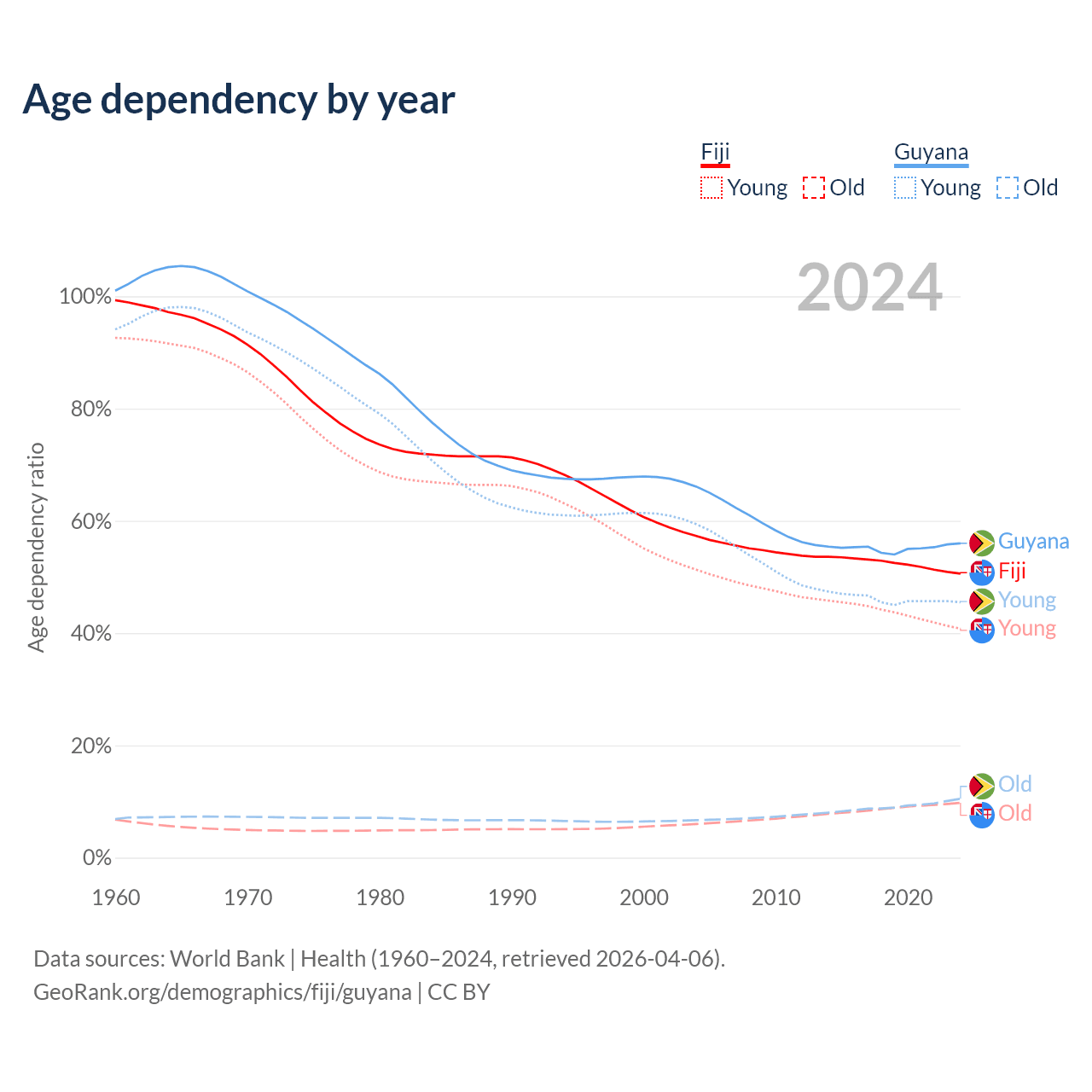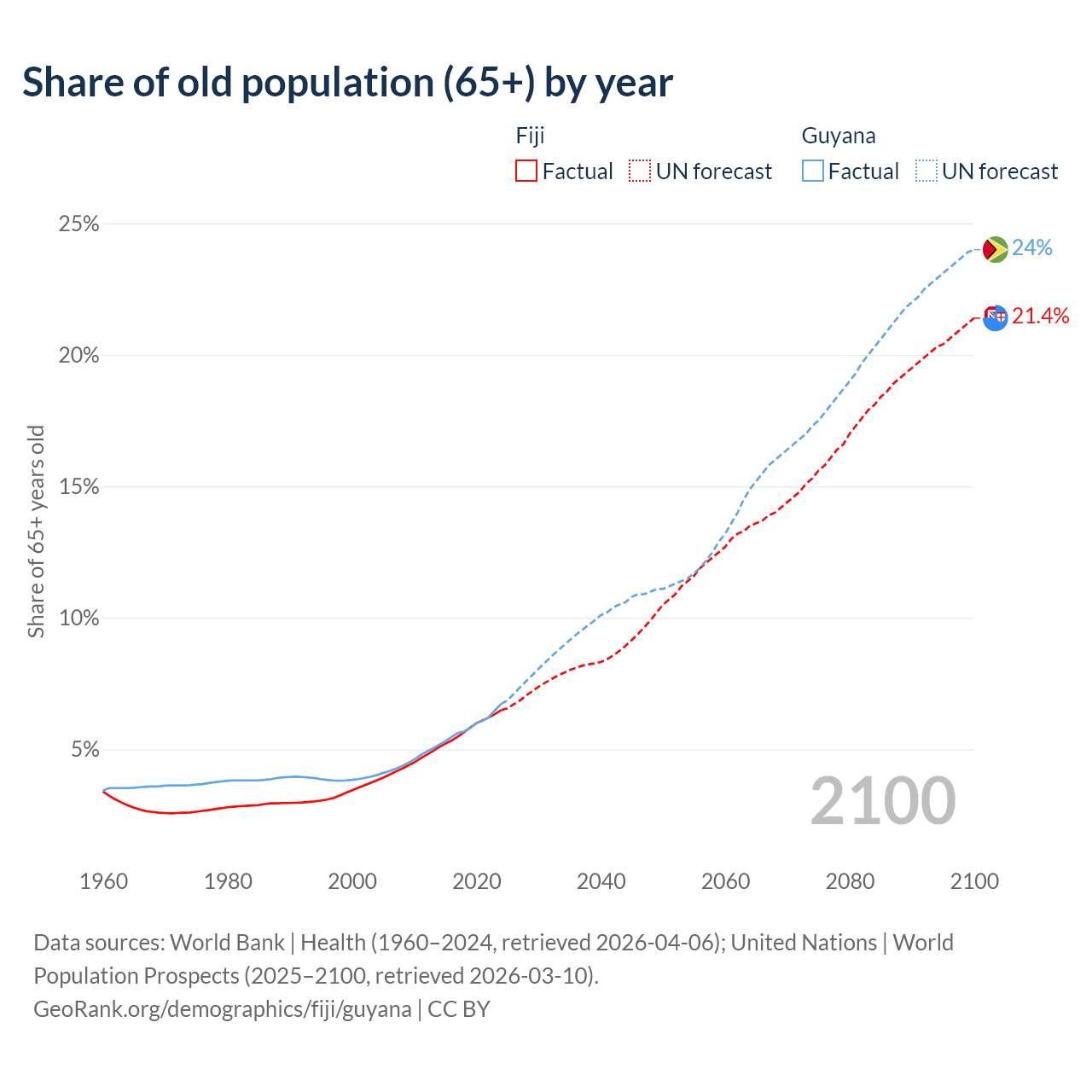 - The share of old-age demographic (65+) in Fiji is 6.49% vs 6.73% in Guyana.