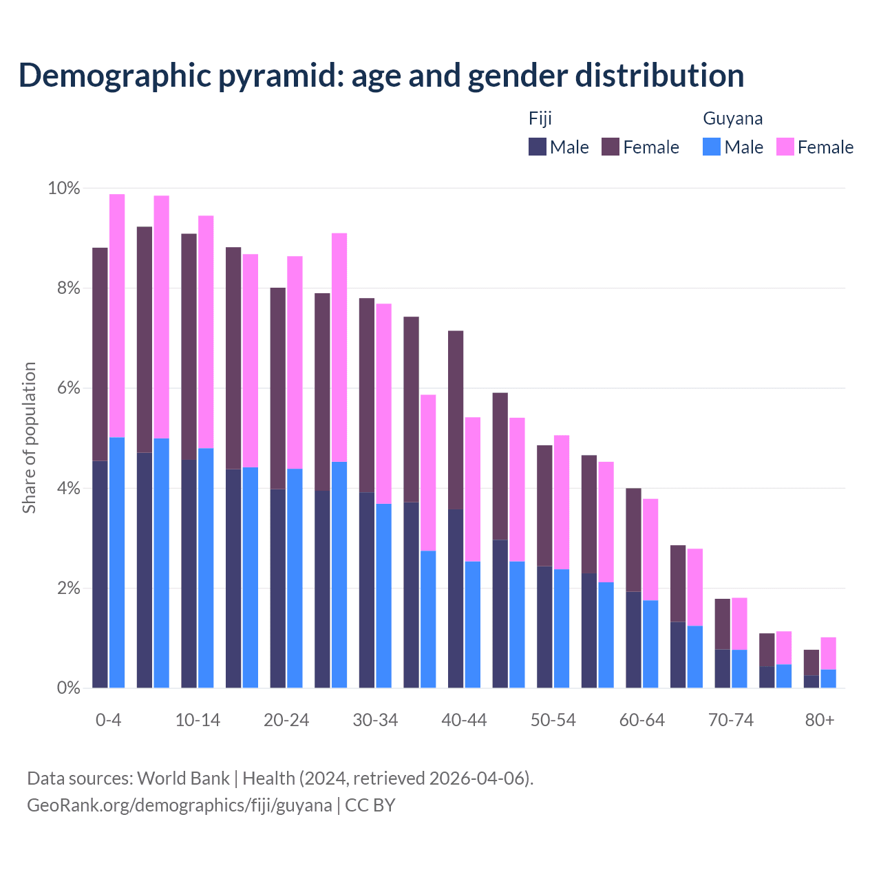 - Fiji is ranked 113/196 by median age (oldest to youngest) vs 122/196 for Guyana.