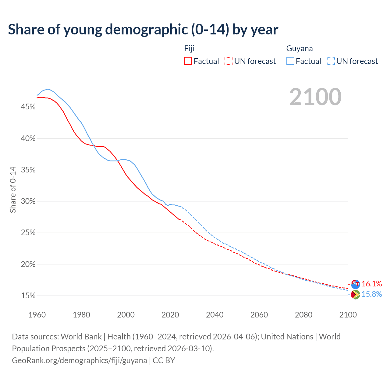 - The share of young demographic (0-15 years old) in Fiji is 27.1% vs 29.2% in Guyana.