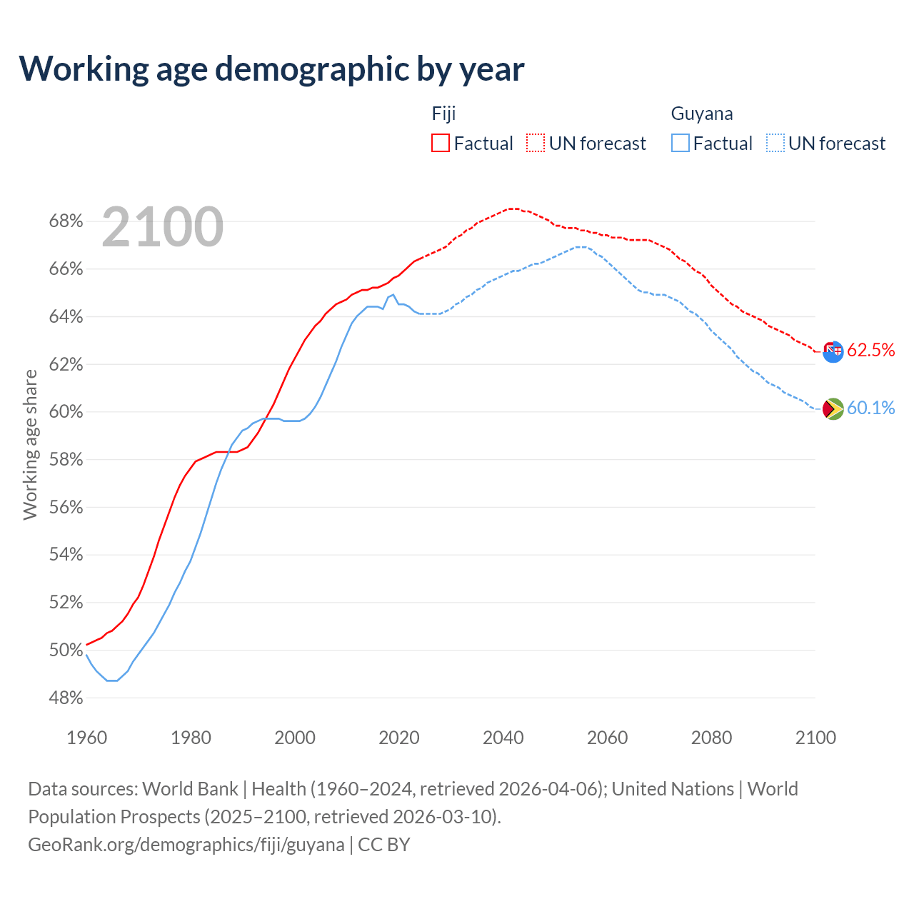 - Fiji has 623K working age adults (aged 15-64) vs 540K in Guyana.