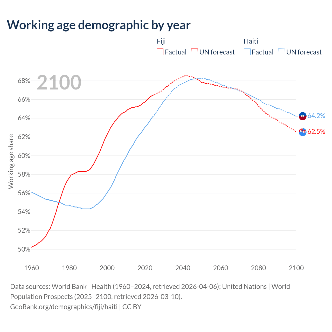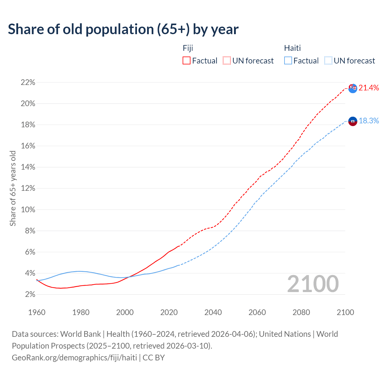 The share of older people aged 65 and over is 6.49% in Fiji and 4.71% in Haiti. Life expectancy in Fiji compared to Haiti .