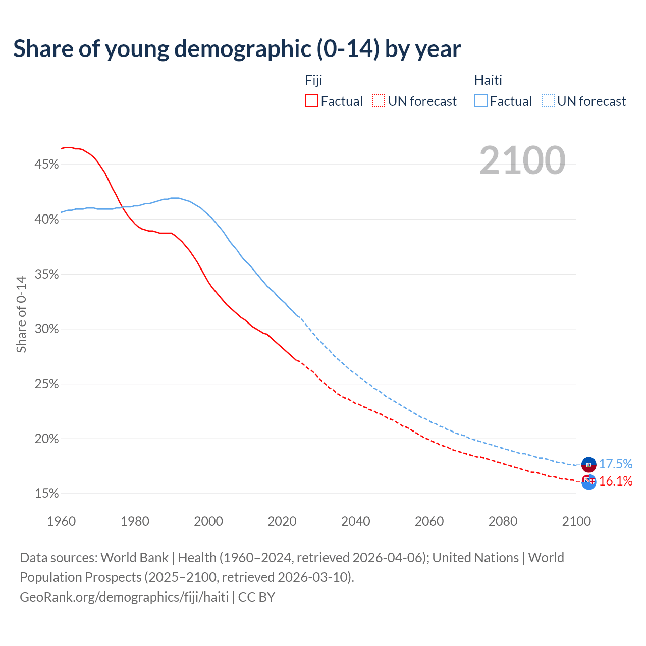 - The share of young demographic (0-15 years old) in Fiji is 27.1% vs 31.2% in Haiti.