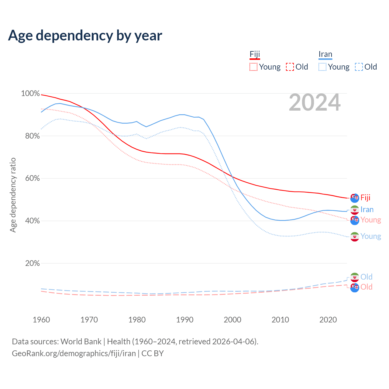 - The share of old-age demographic (65+) in Fiji is 6.49% vs 8.24% in Iran.