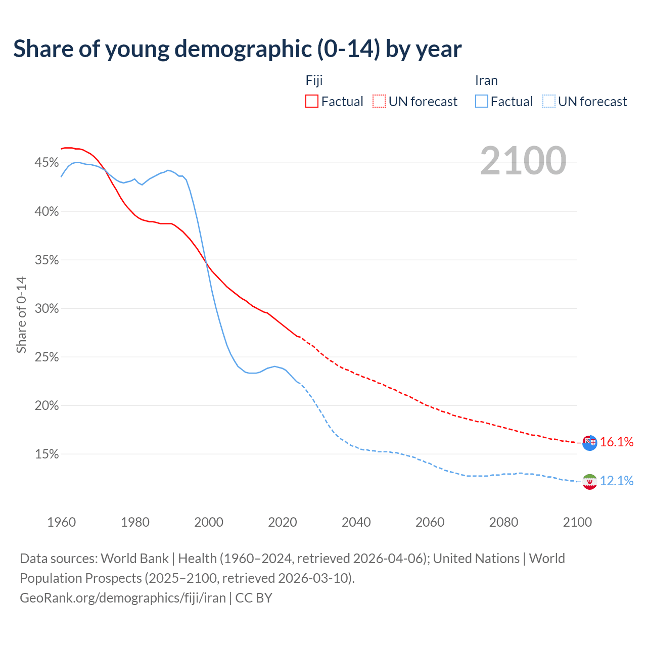 - The share of young demographic (0-15 years old) in Fiji is 27.1% vs 22.4% in Iran.