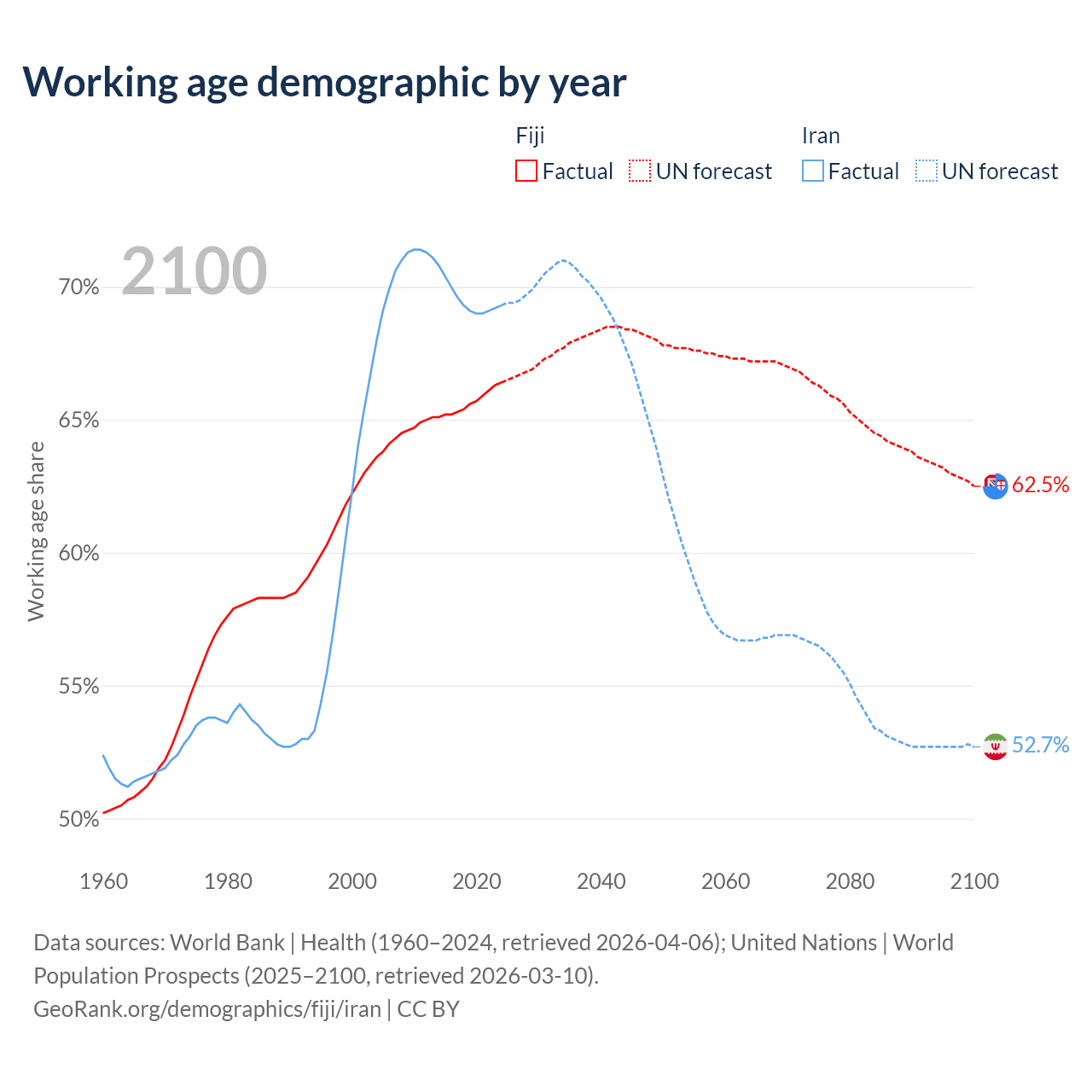 - Fiji has 623K working age adults (aged 15-64) vs 64.8M in Iran.