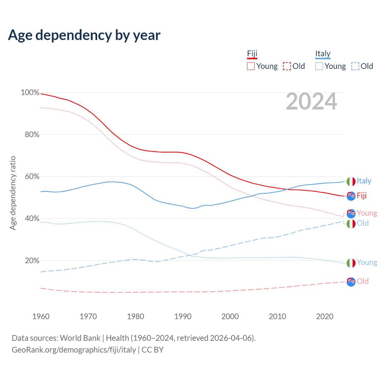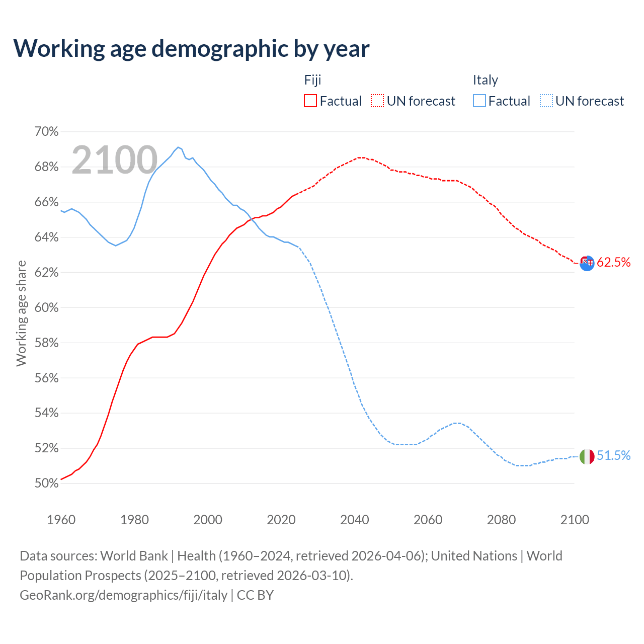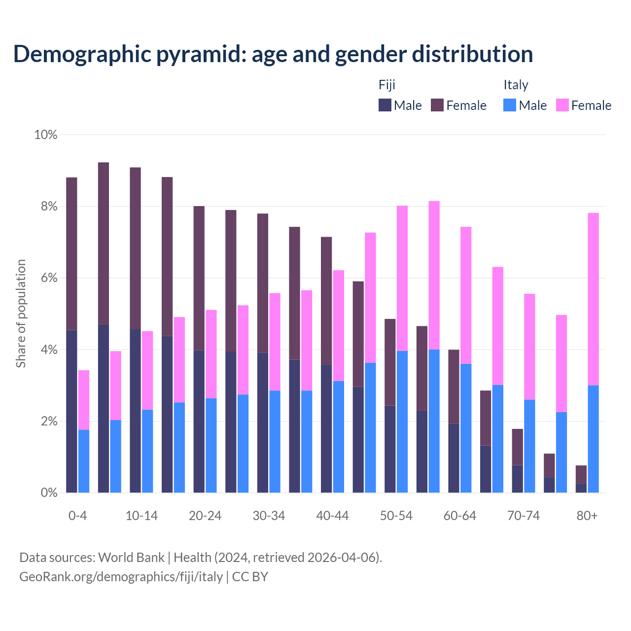 - The share of old-age demographic (65+) in Fiji is 6.49% vs 24.6% in Italy.
