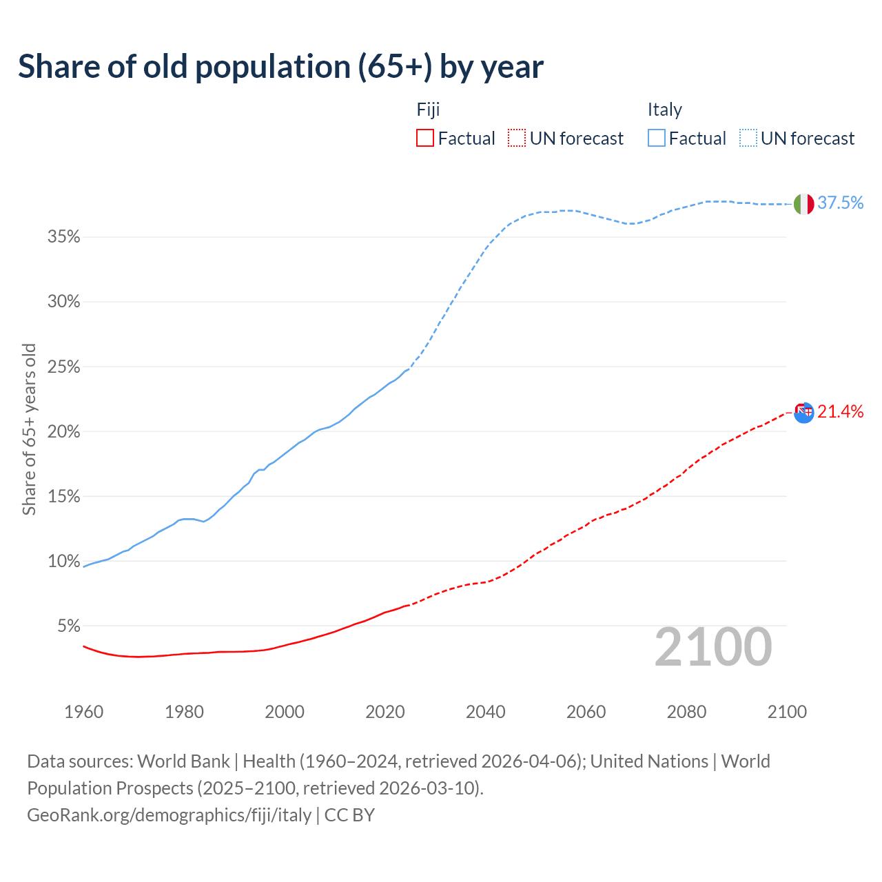 The share of older people aged 65 and over is 6.49% in Fiji and 24.6% in Italy. Life expectancy in Fiji compared to Italy .