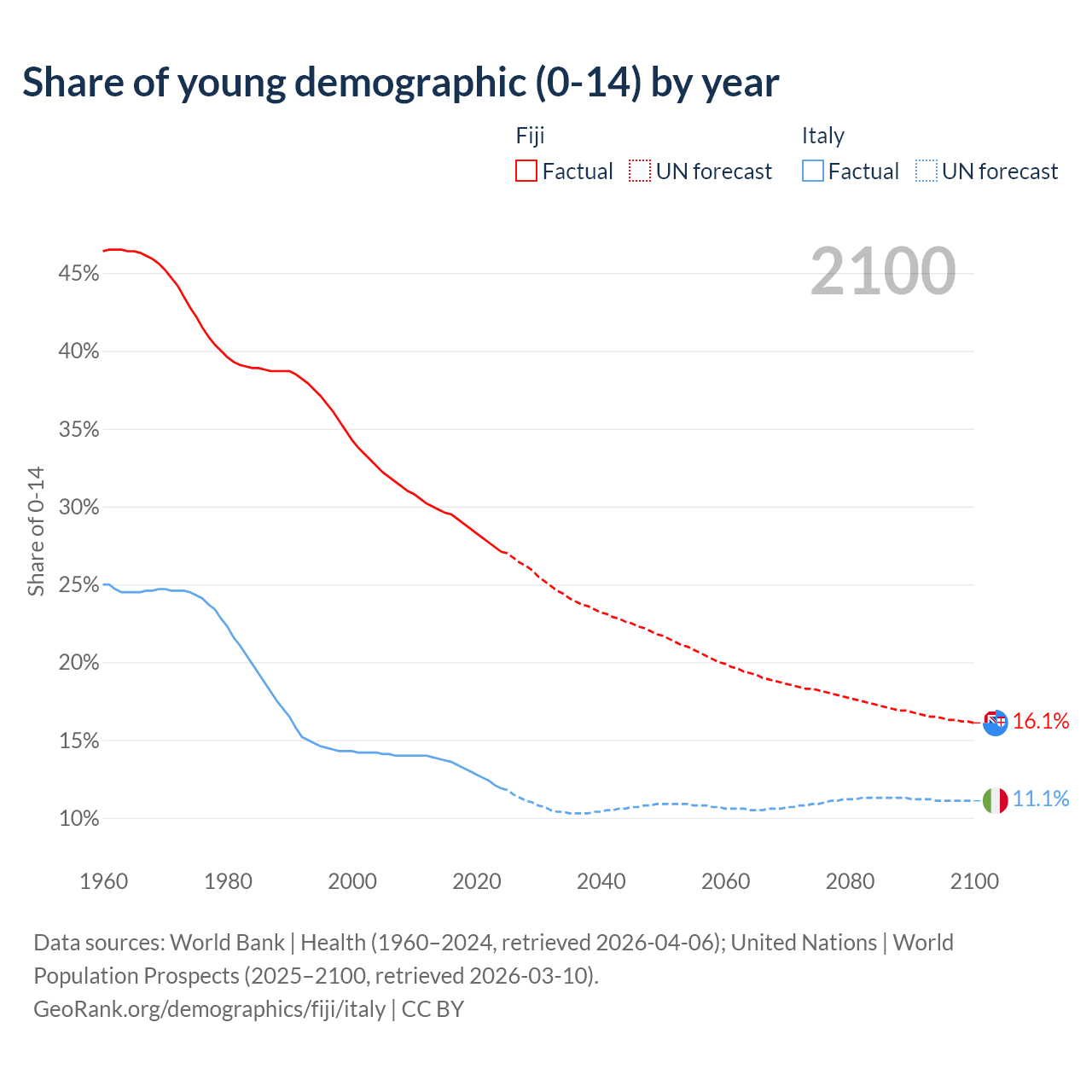 - The share of young demographic (0-15 years old) in Fiji is 27.1% vs 11.9% in Italy.