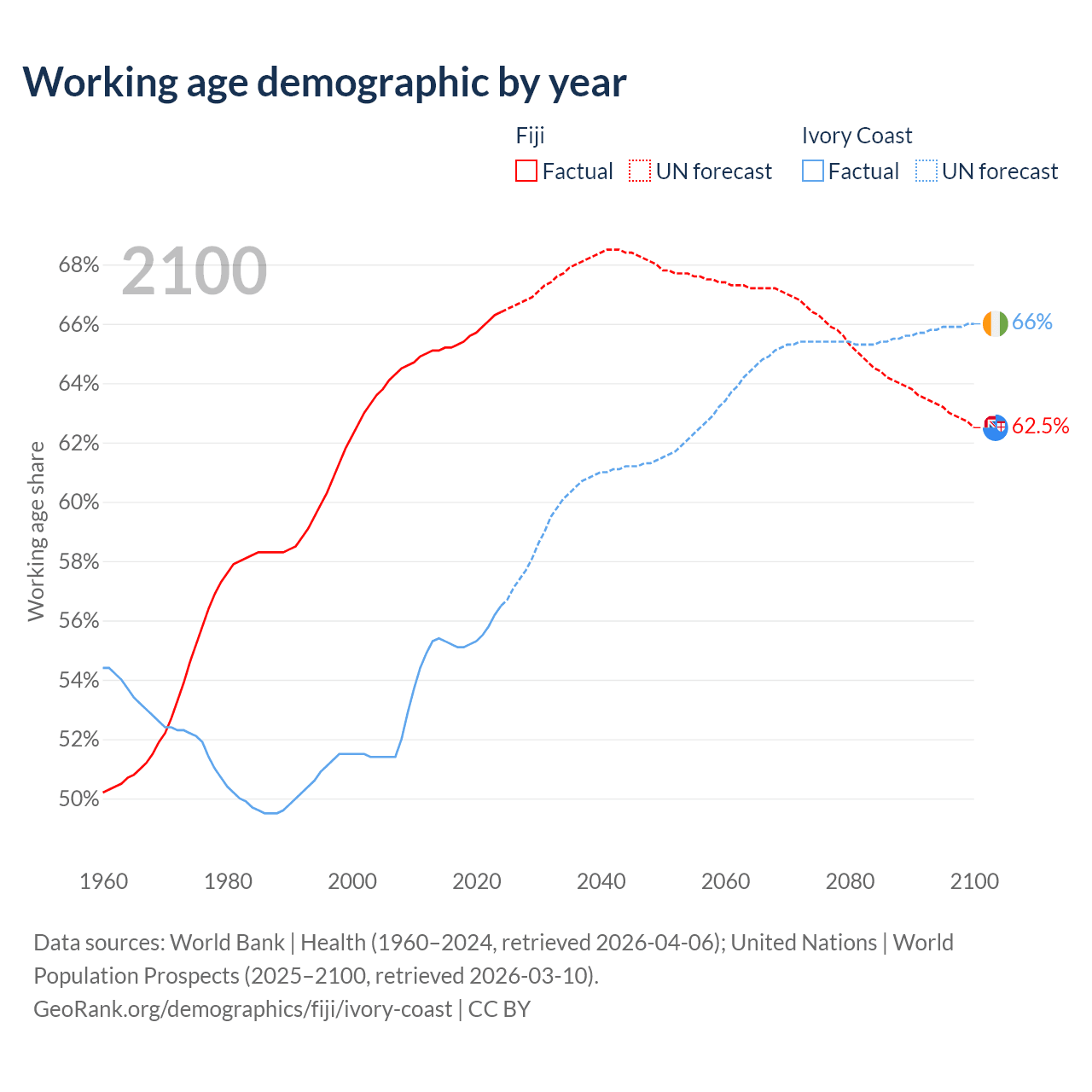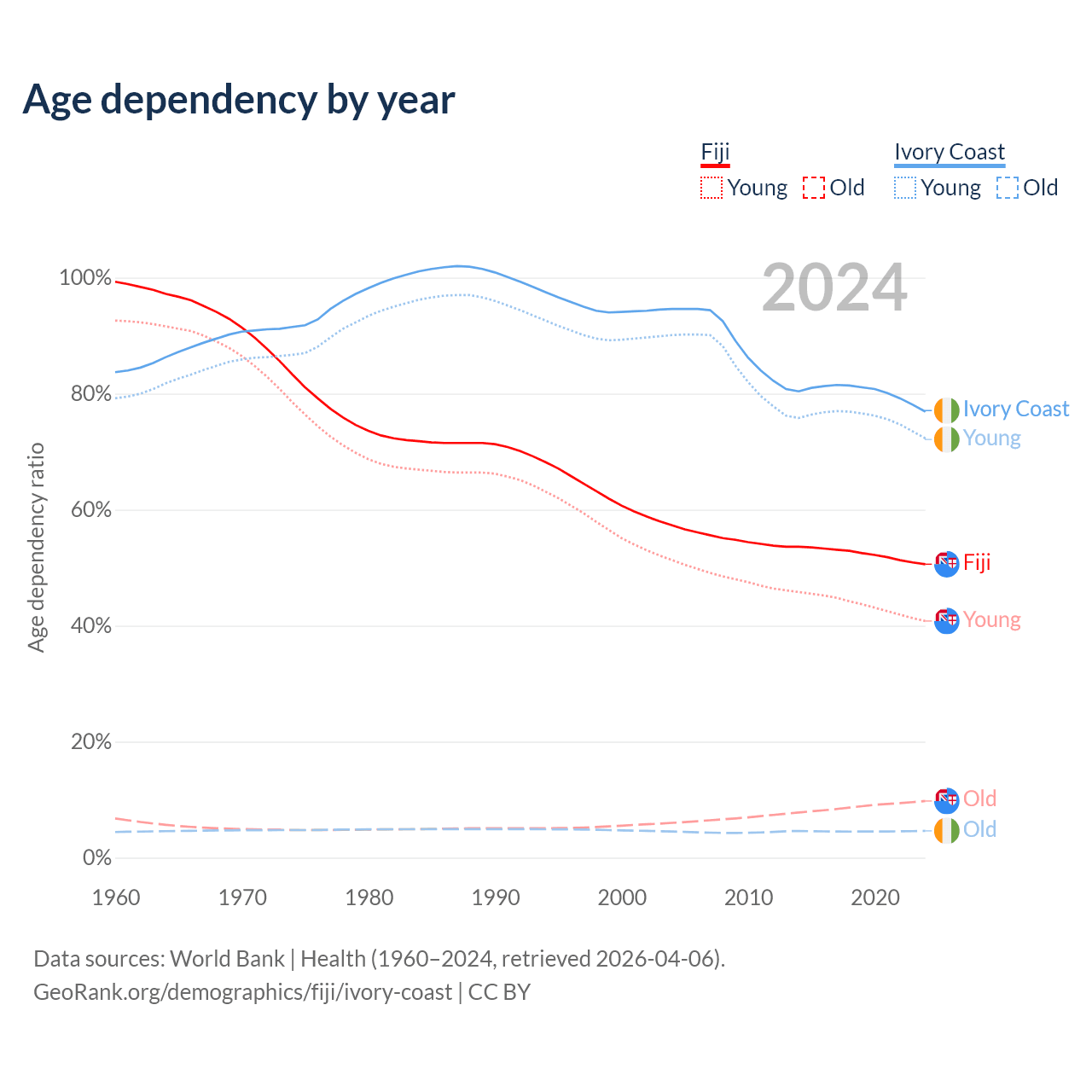- The share of old-age demographic (65+) in Fiji is 6.49% vs 2.61% in Ivory Coast.