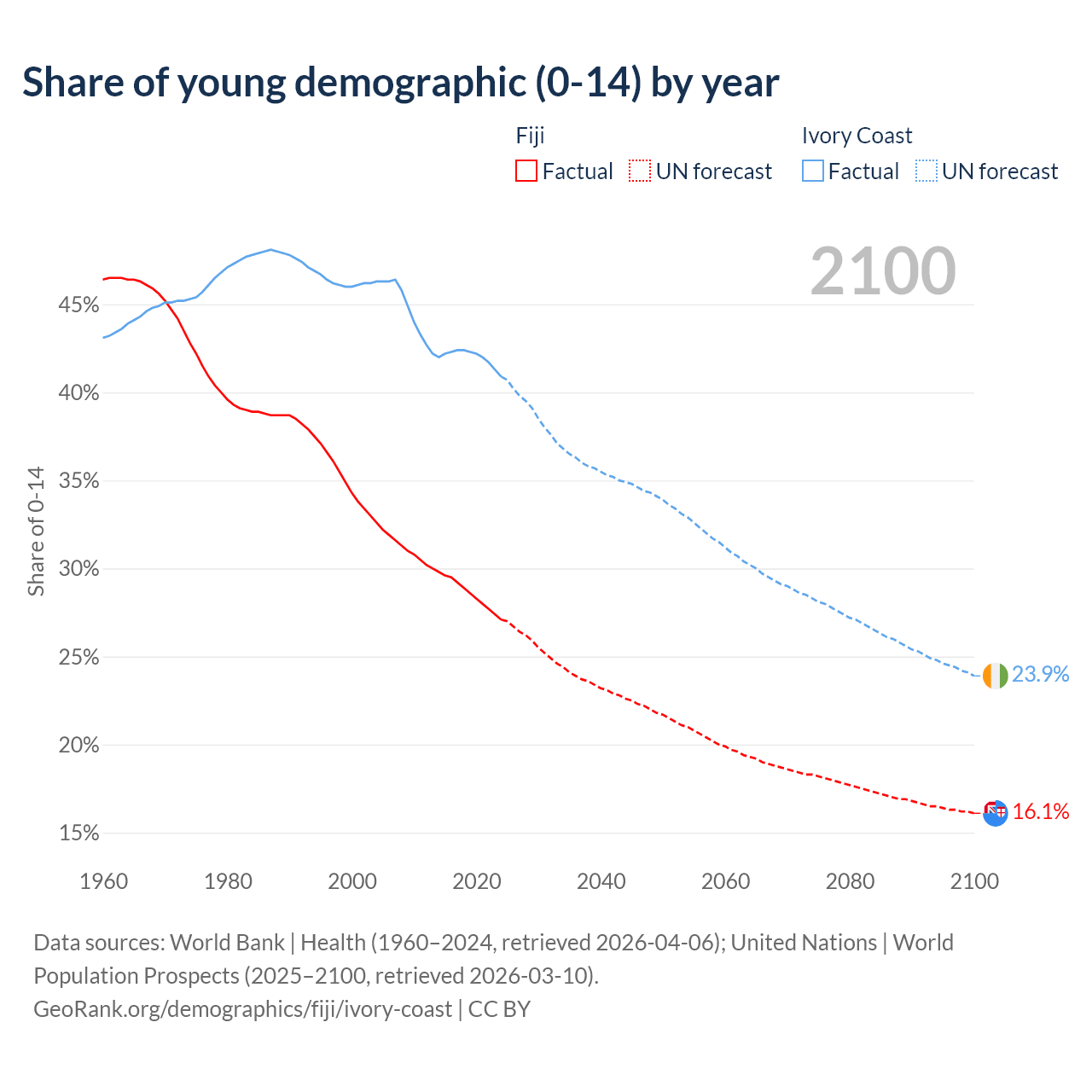 - The share of young demographic (0-15 years old) in Fiji is 27.1% vs 40.9% in Ivory Coast.