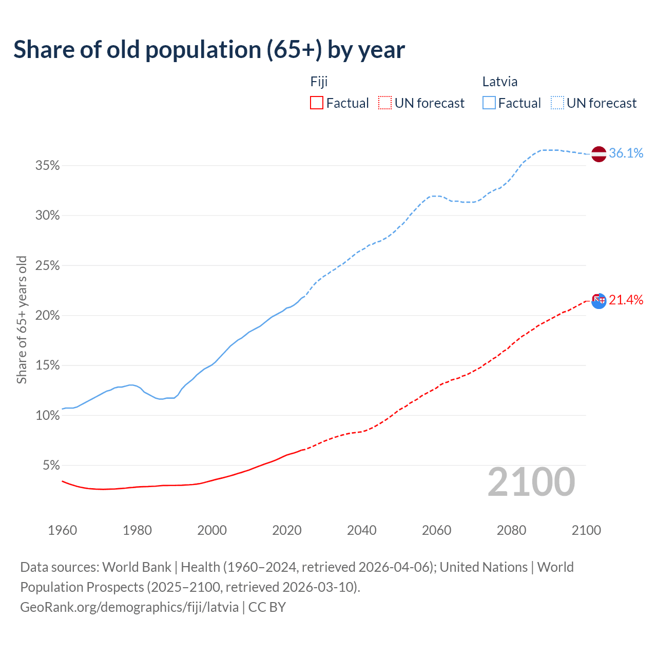 - The share of old-age demographic (65+) in Fiji is 6.49% vs 21.7% in Latvia.