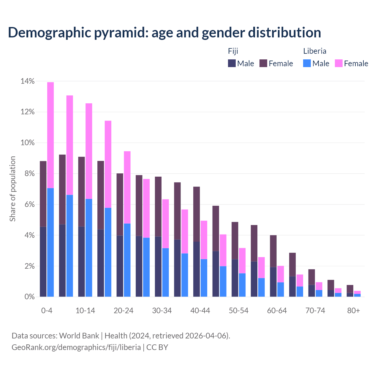 - The share of old-age demographic (65+) in Fiji is 6.49% vs 3.3% in Liberia.