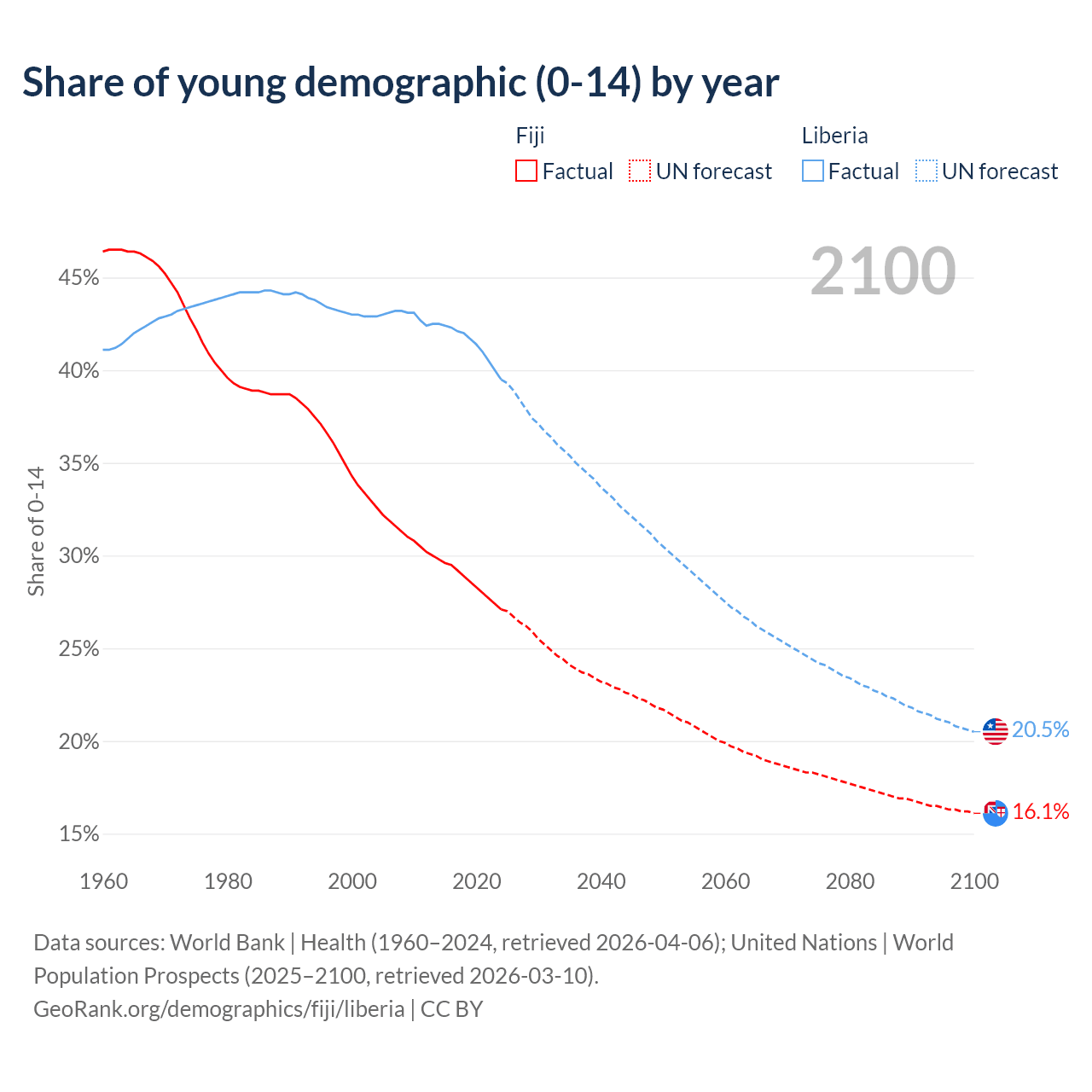 - The share of young demographic (0-15 years old) in Fiji is 27.1% vs 39.5% in Liberia.