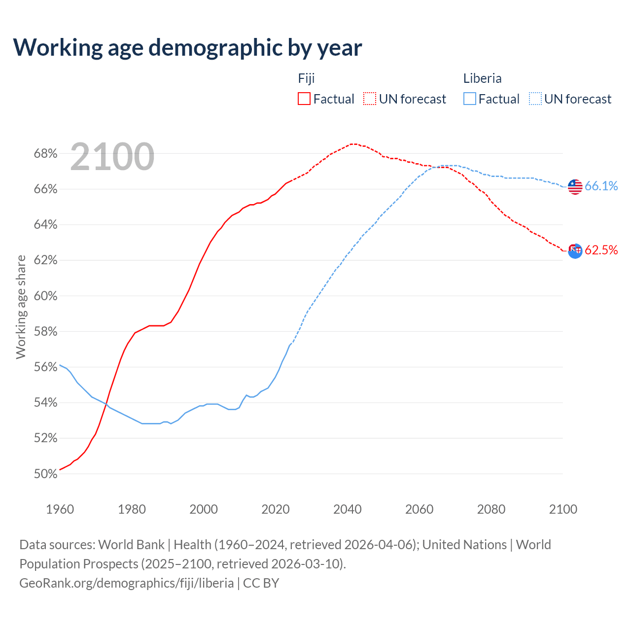 Median age Fiji vs Liberia, 1960-2100