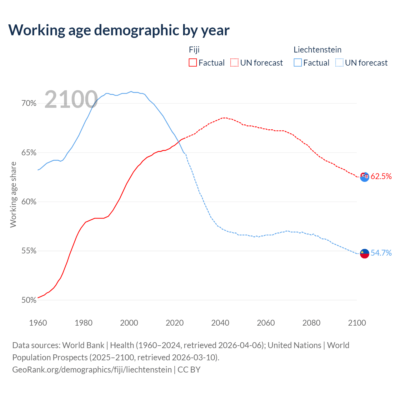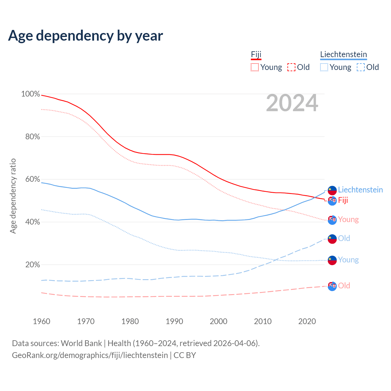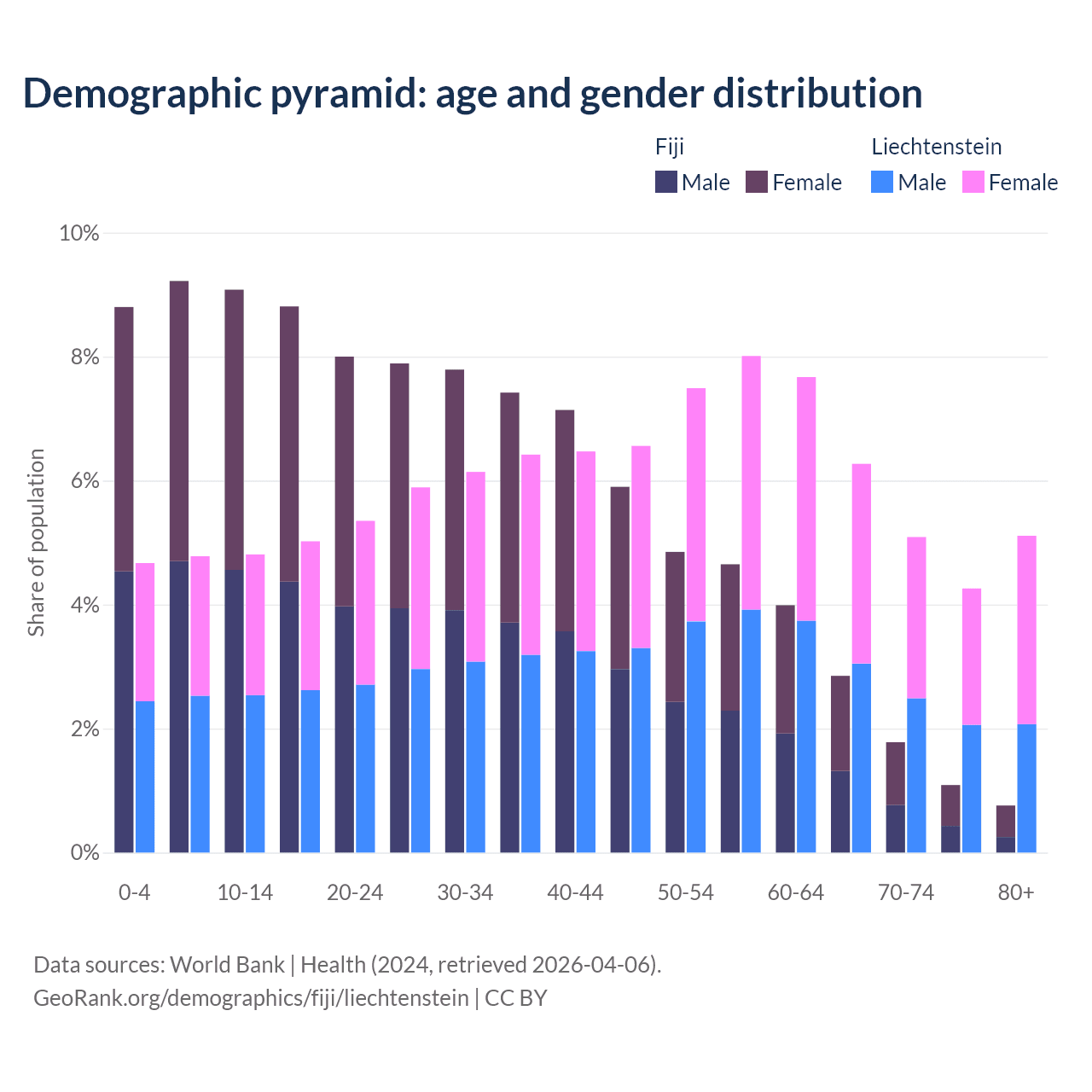 - The share of old-age demographic (65+) in Fiji is 6.49% vs 20.7% in Liechtenstein.