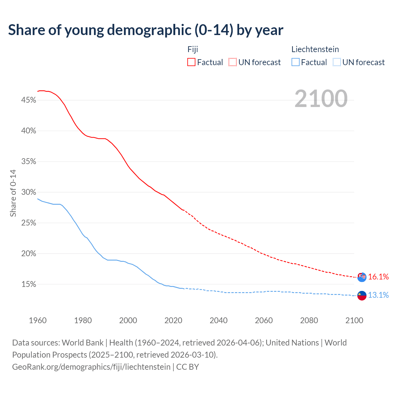 - The share of young demographic (0-15 years old) in Fiji is 27.1% vs 14.3% in Liechtenstein.