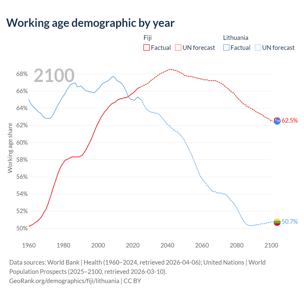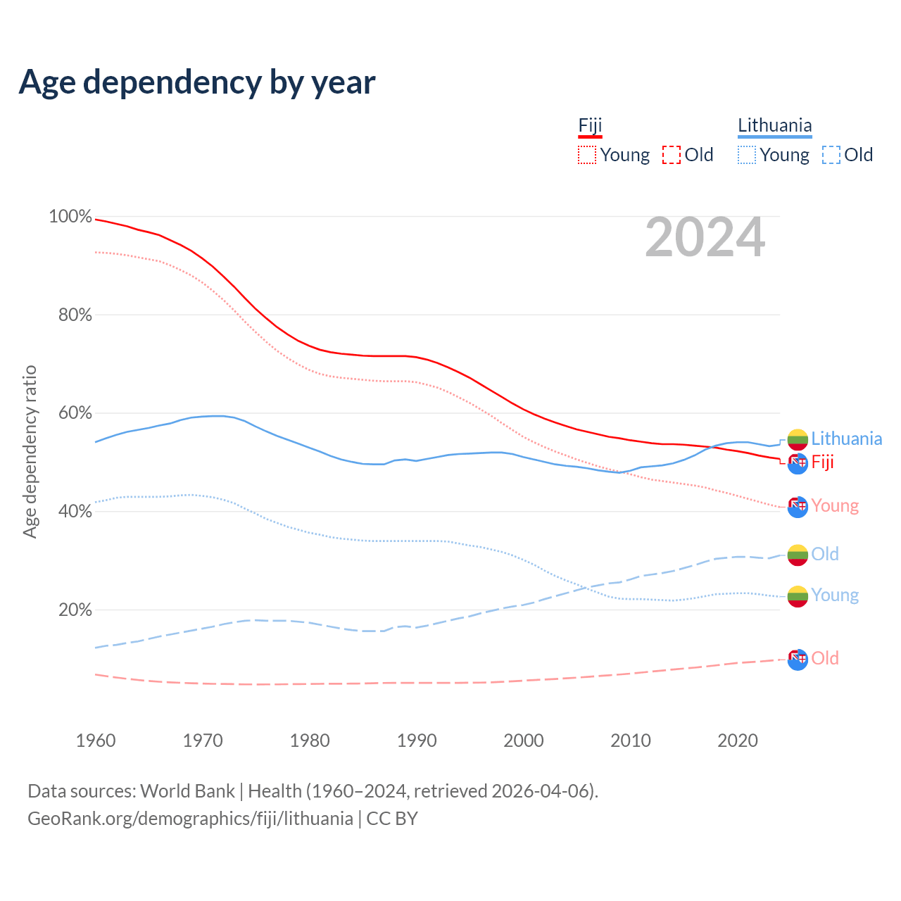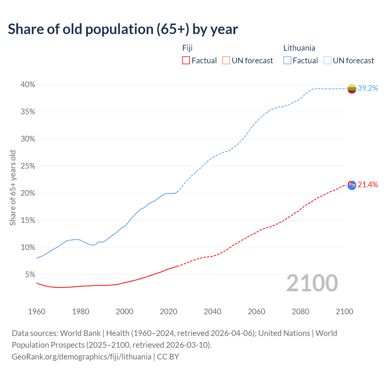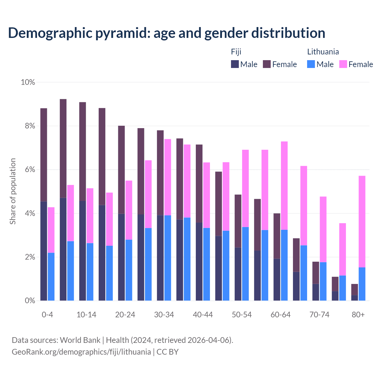 - The share of old-age demographic (65+) in Fiji is 6.49% vs 20.2% in Lithuania.