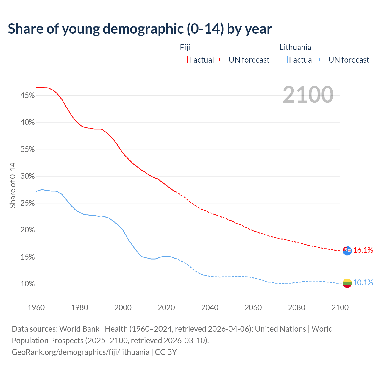- The share of young demographic (0-15 years old) in Fiji is 27.1% vs 14.7% in Lithuania.