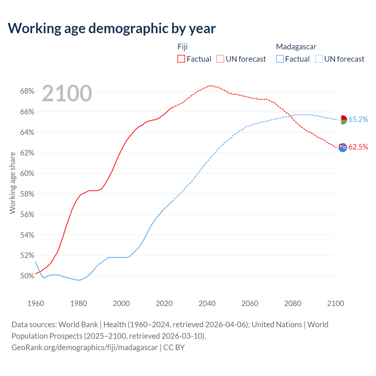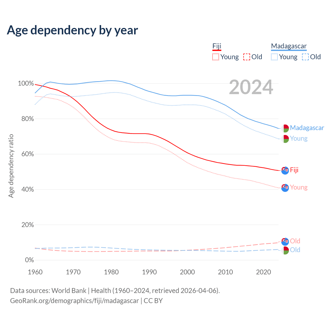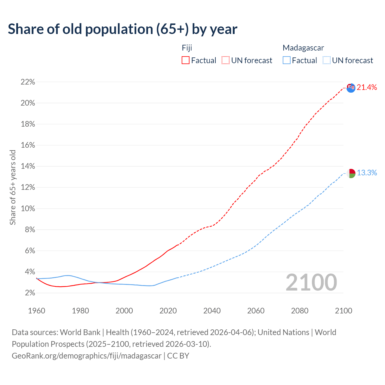 - The share of old-age demographic (65+) in Fiji is 6.49% vs 3.41% in Madagascar.
