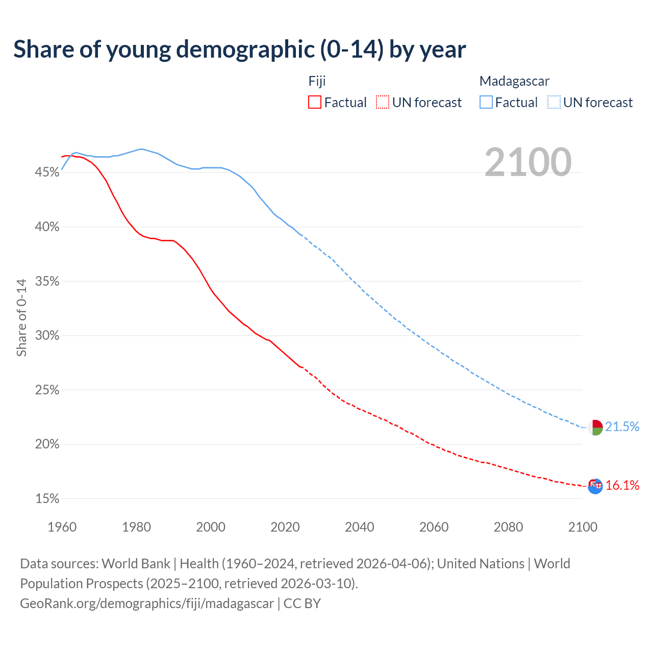 - The share of young demographic (0-15 years old) in Fiji is 27.1% vs 39.3% in Madagascar.
